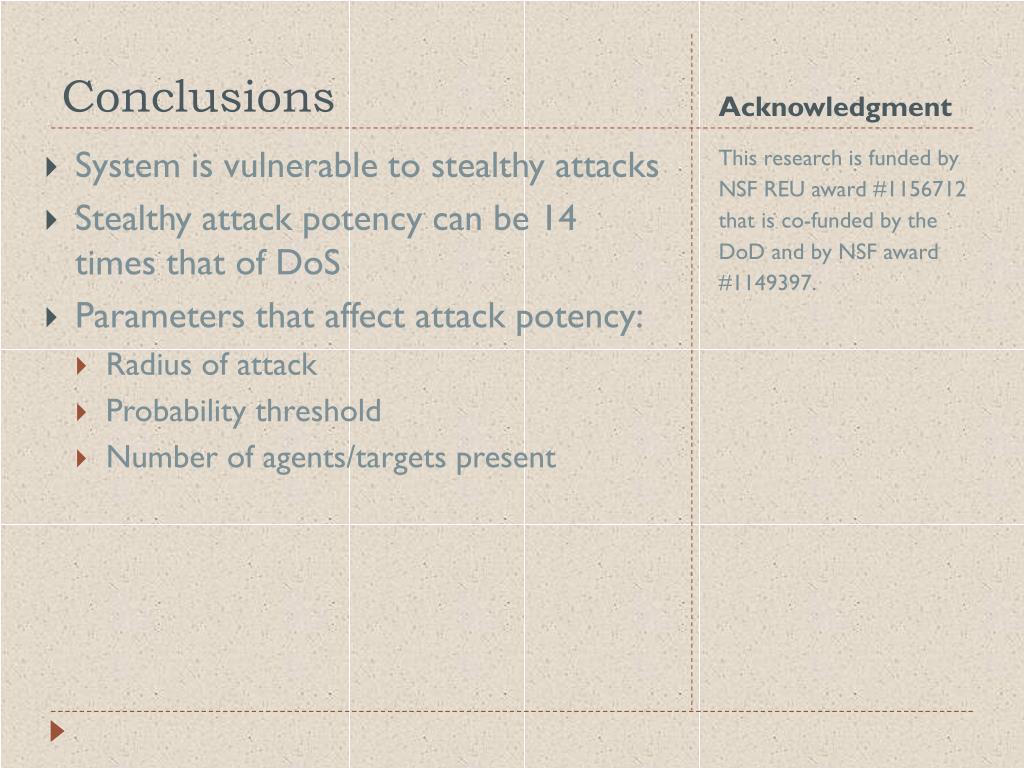 Conclusions • System is vulnerable to stealthy attacks • Stealthy attack potency can be 14 times that of DoS • Parameters that affect attack potency: • Radius of attack • Probability threshold • Number of agents/targets present Acknowledgment This research is funded by NSF REU award #1156712 that is co-funded by the DoD and by NSF award #1149397.