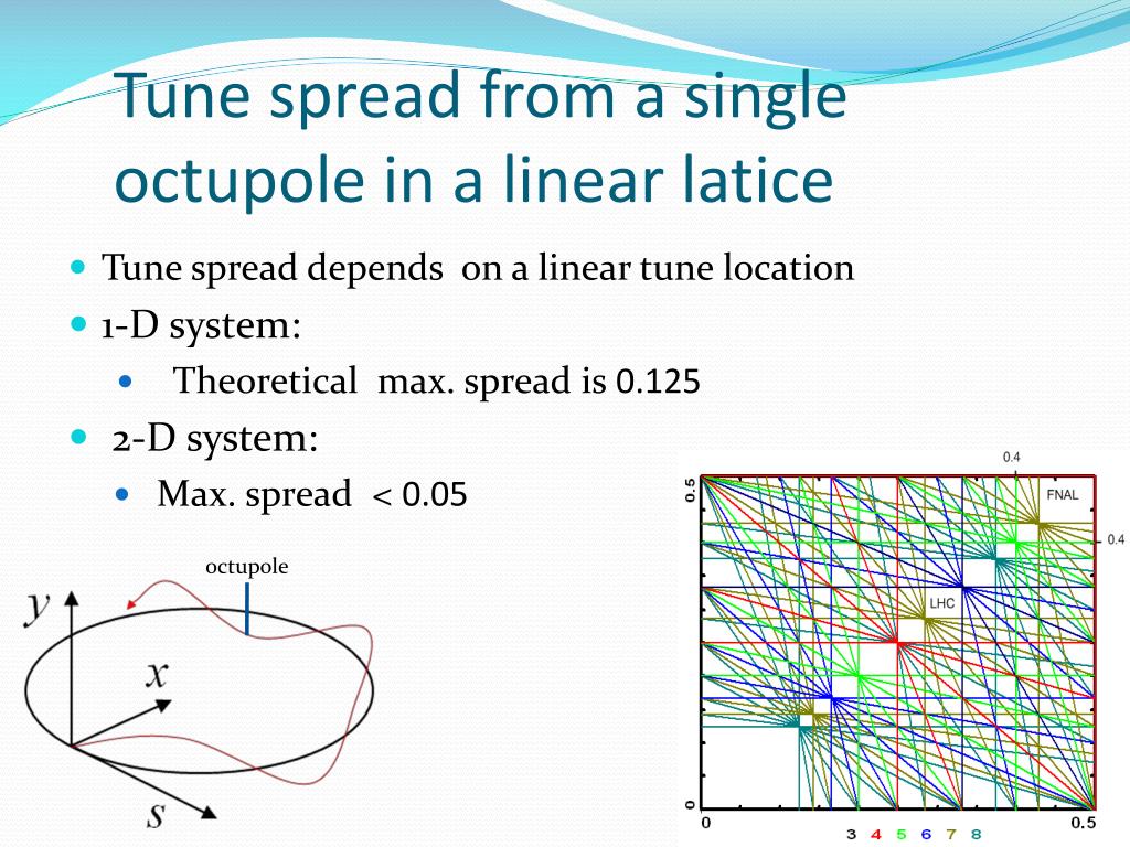 Tune spread from a single octupole in a linear latice • Tune spread depends on a linear tune location • 1-D system: • Theoretical max. spread is 0.125 • 2-D system: • Max. spread < 0.05 octupole