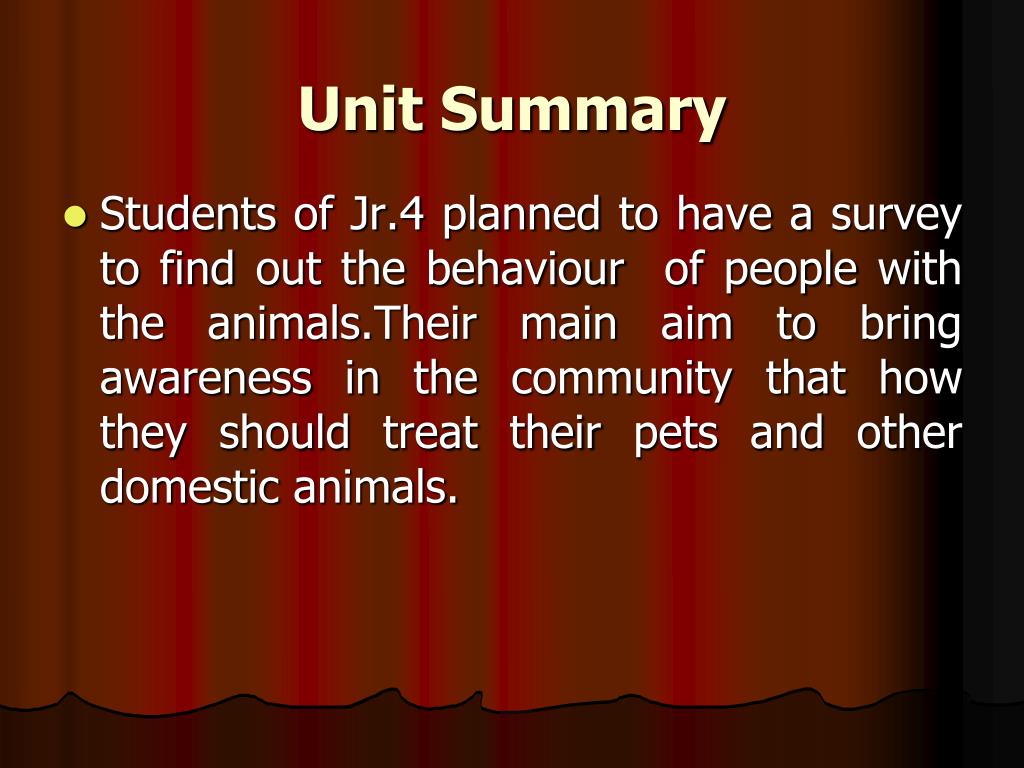 Unit Summary • Students of Jr.4 planned to have a survey to find out the behaviour of people with the animals.Their main aim to bring awareness in the community that how they should treat their pets and other domestic animals.