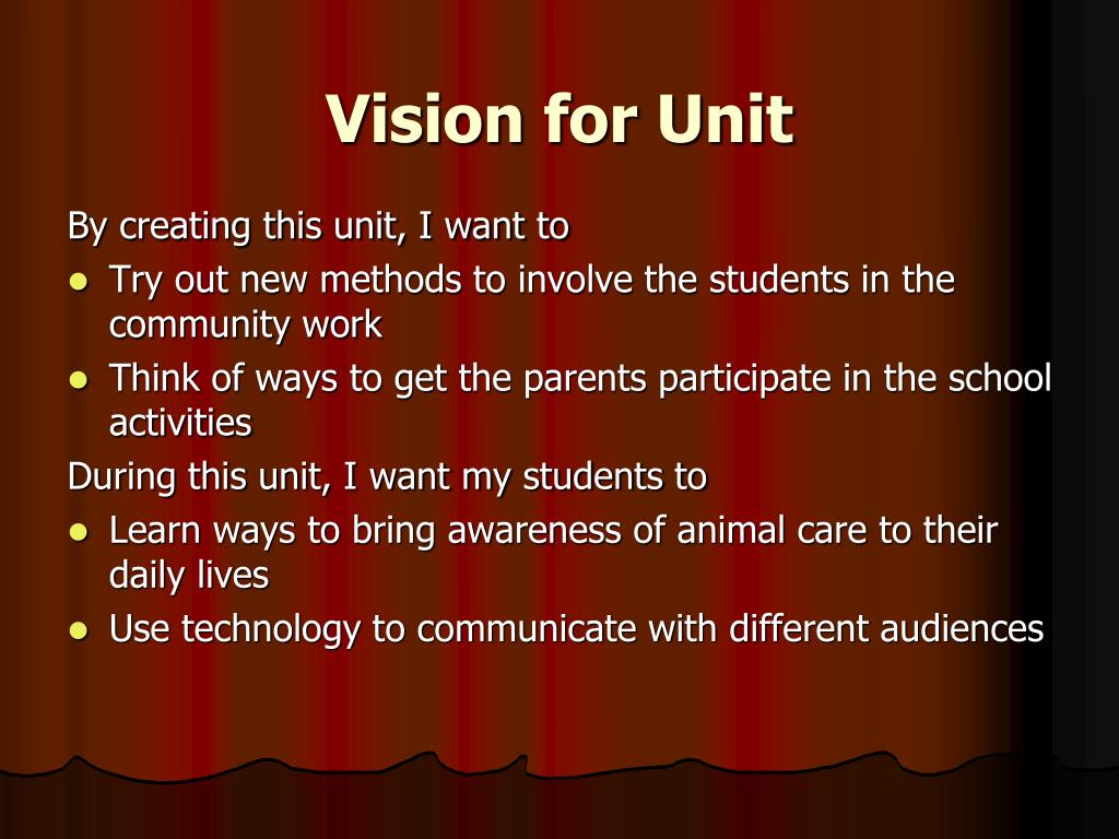 Vision for Unit By creating this unit, I want to • Try out new methods to involve the students in the community work • Think of ways to get the parents participate in the school activities During this unit, I want my students to • Learn ways to bring awareness of animal care to their daily lives • Use technology to communicate with different audiences