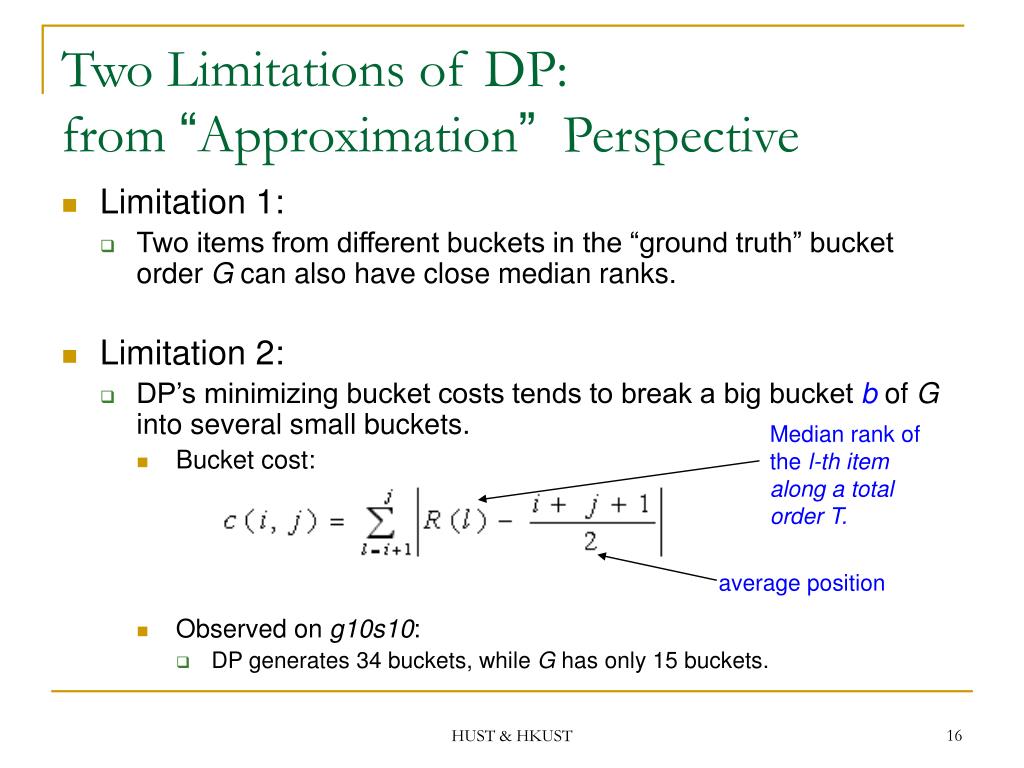 Two Limitations of DP:from “Approximation” Perspective • Limitation 1: • Two items from different buckets in the “ground truth” bucket order G can also have close median ranks. • Limitation 2: • DP’s minimizing bucket costs tends to break a big bucket b of G into several small buckets. • Bucket cost: • Observed on g10s10: • DP generates 34 buckets, while G has only 15 buckets. Median rank of the l-th item along a total order T. average position HUST & HKUST