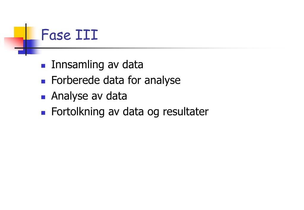 Fase III • Innsamling av data • Forberede data for analyse • Analyse av data • Fortolkning av data og resultater
