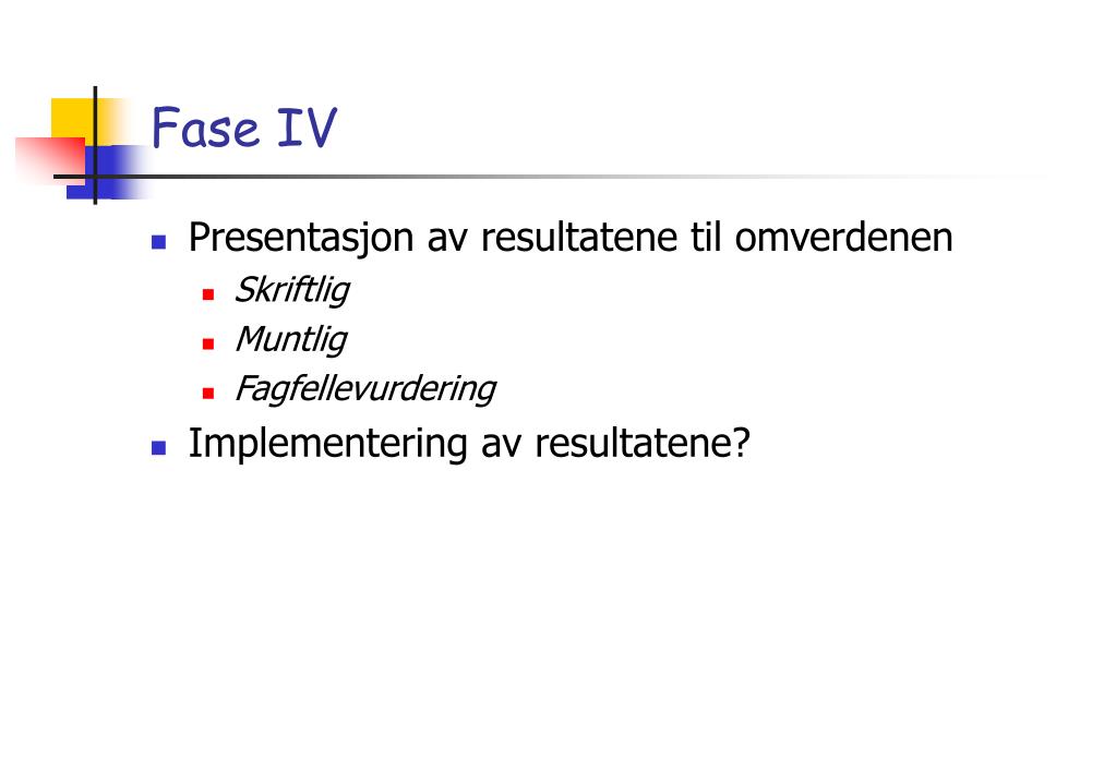 Fase IV • Presentasjon av resultatene til omverdenen • Skriftlig • Muntlig • Fagfellevurdering • Implementering av resultatene?