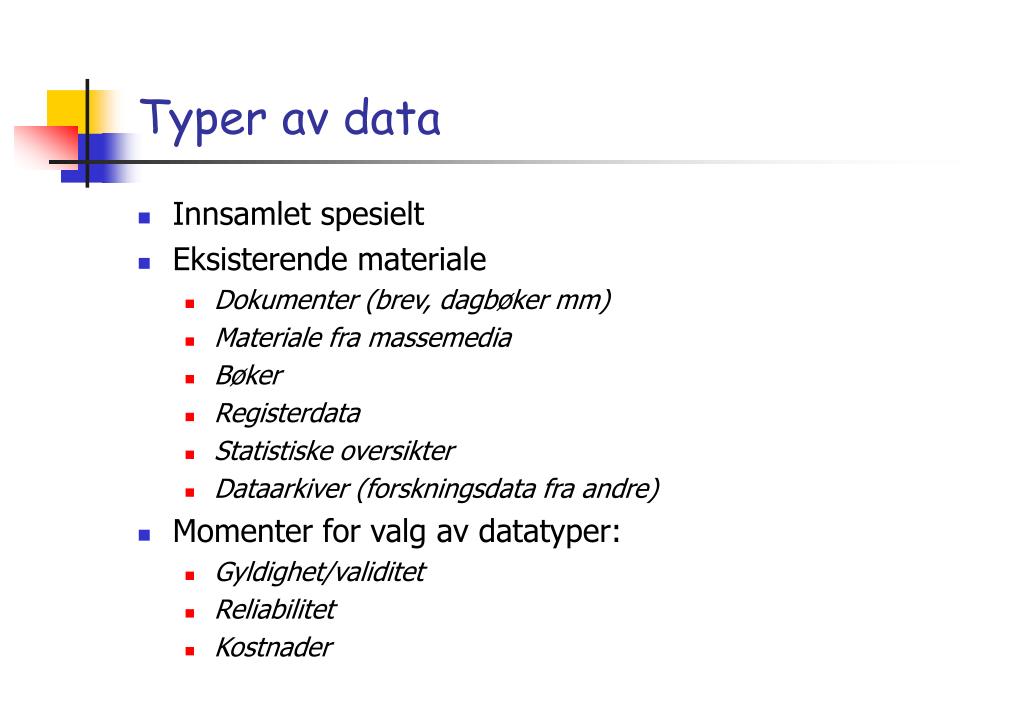 Typer av data • Innsamlet spesielt • Eksisterende materiale • Dokumenter (brev, dagbøker mm) • Materiale fra massemedia • Bøker • Registerdata • Statistiske oversikter • Dataarkiver (forskningsdata fra andre) • Momenter for valg av datatyper: • Gyldighet/validitet • Reliabilitet • Kostnader