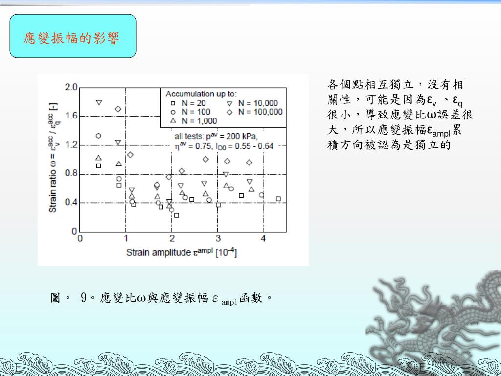 應變振幅的影響 應該要與Sawicki 和 S ´ widzin´ski 所提出的”共同夯實曲線“吻合,但顯然沒有 圖。 7。累積應變 與應變振幅函數的平方 不同的N各做9次試驗 累積應變正規化,除以初始密度 主要成正比關係 圖。 8。累積應變εacc和圖。