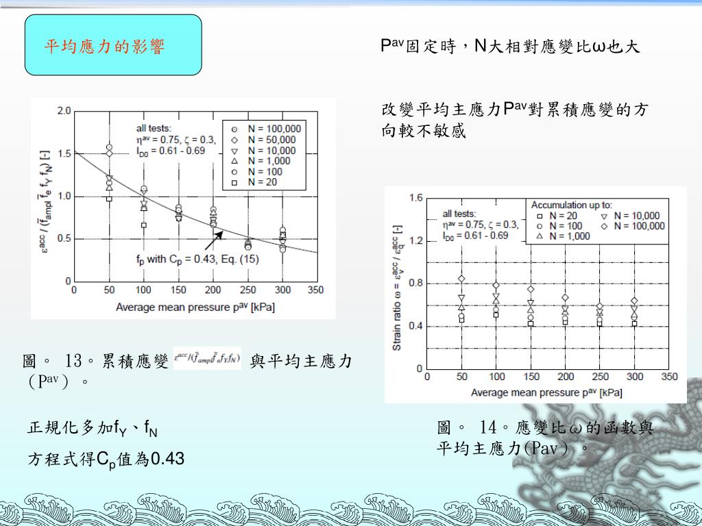 平均應力的影響 圖。 13。累積應變與平均主應力(Pav)。 Pav固定時,N大相對應變比ω也大 改變平均主應力Pav對累積應變的方向較不敏感 正規化多加fY、fN 方程式得Cp值為0.43 圖。 14。應變比ω的函數與 平均主應力(Pav)。