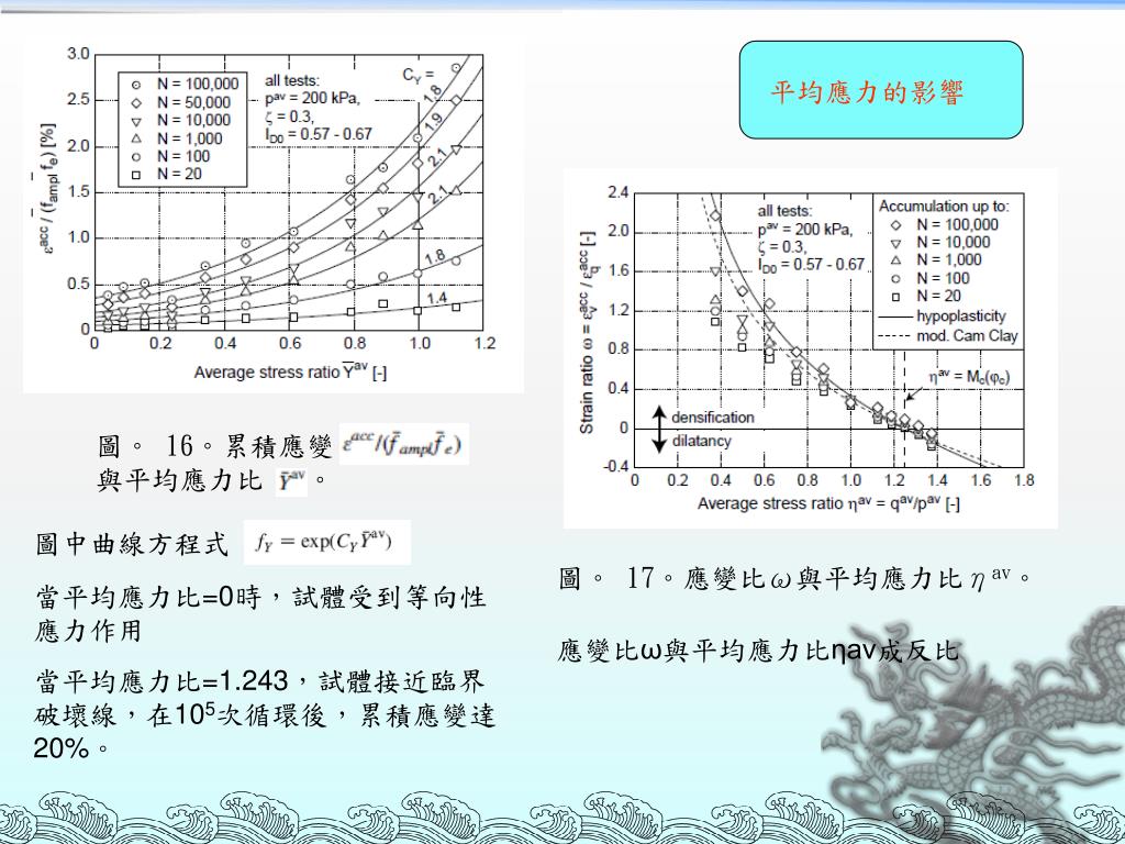 平均應力的影響 圖。 16。累積應變與平均應力比。 圖中曲線方程式 圖。 17。應變比ω與平均應力比ηav。 當平均應力比=0時,試體受到等向性應力作用 當平均應力比=1.243,試體接近臨界破壞線,在105次循環後,累積應變達20%。 應變比ω與平均應力比ηav成反比