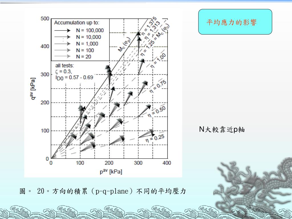 平均應力的影響 N大較靠近p軸 圖。 20。方向的積累(p-q-plane)不同的平均壓力