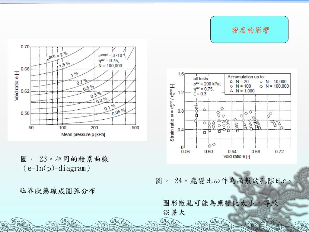 密度的影響 圖。 22。分別為累積應變 與孔隙比e或相對密度指數(ID)。 孔隙比增加,累積應變增加