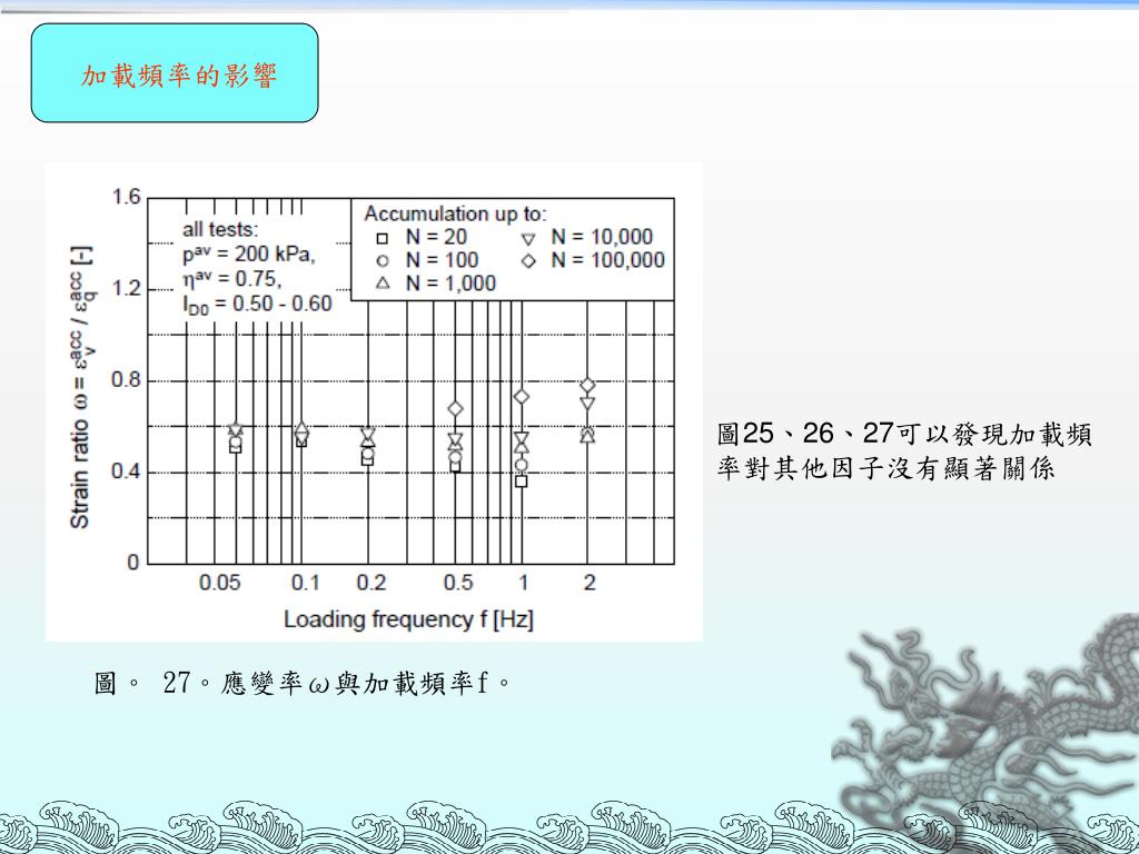 加載頻率的影響 圖25、26、27可以發現加載頻率對其他因子沒有顯著關係 圖。 27。應變率ω與加載頻率f。