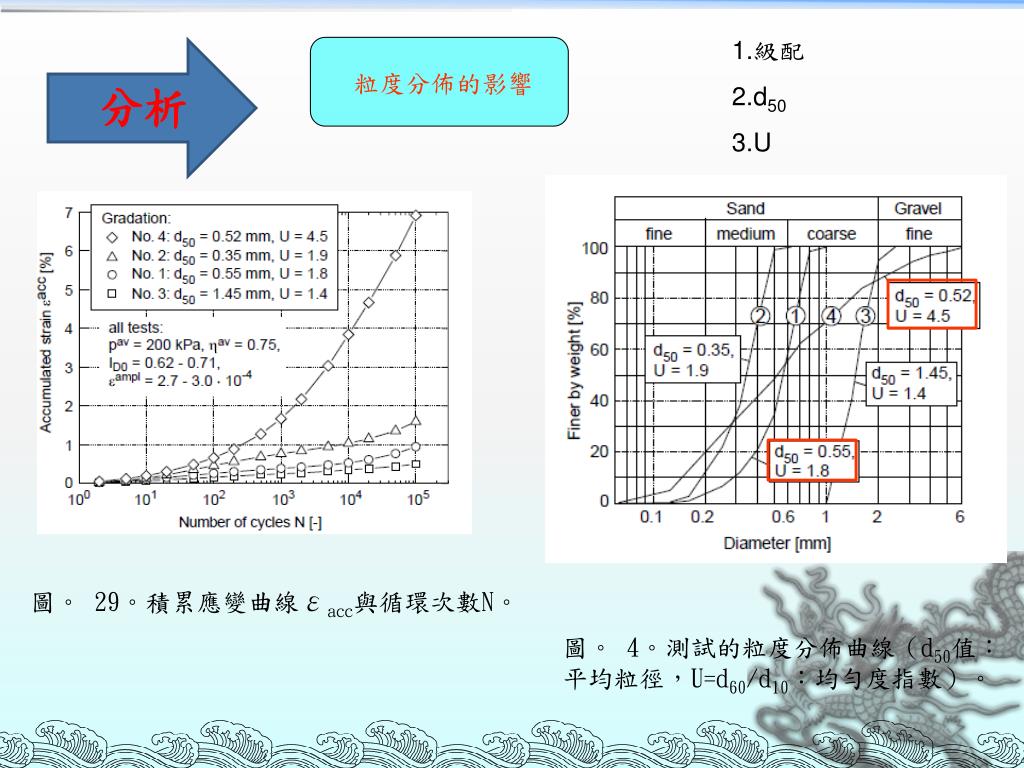 分析 粒度分佈的影響 1.級配 2.d50 3.U 圖。 29。積累應變曲線εacc與循環次數N。 圖。 4。測試的粒度分佈曲線(d50值:平均粒徑,U=d60/d10:均勻度指數)。