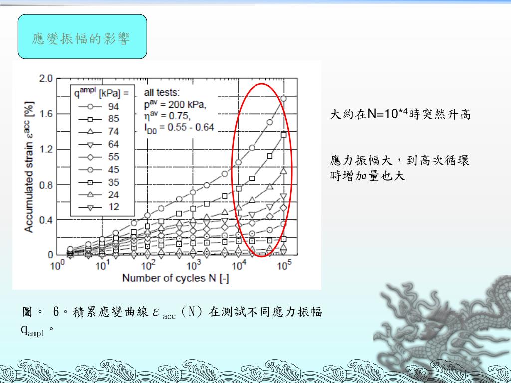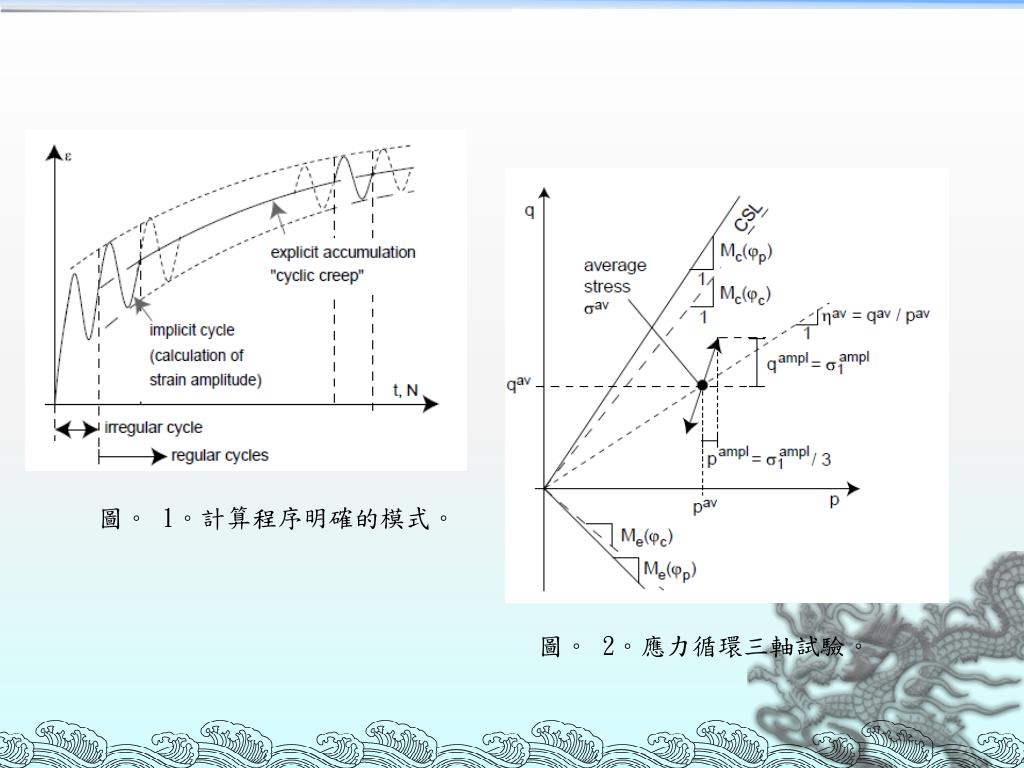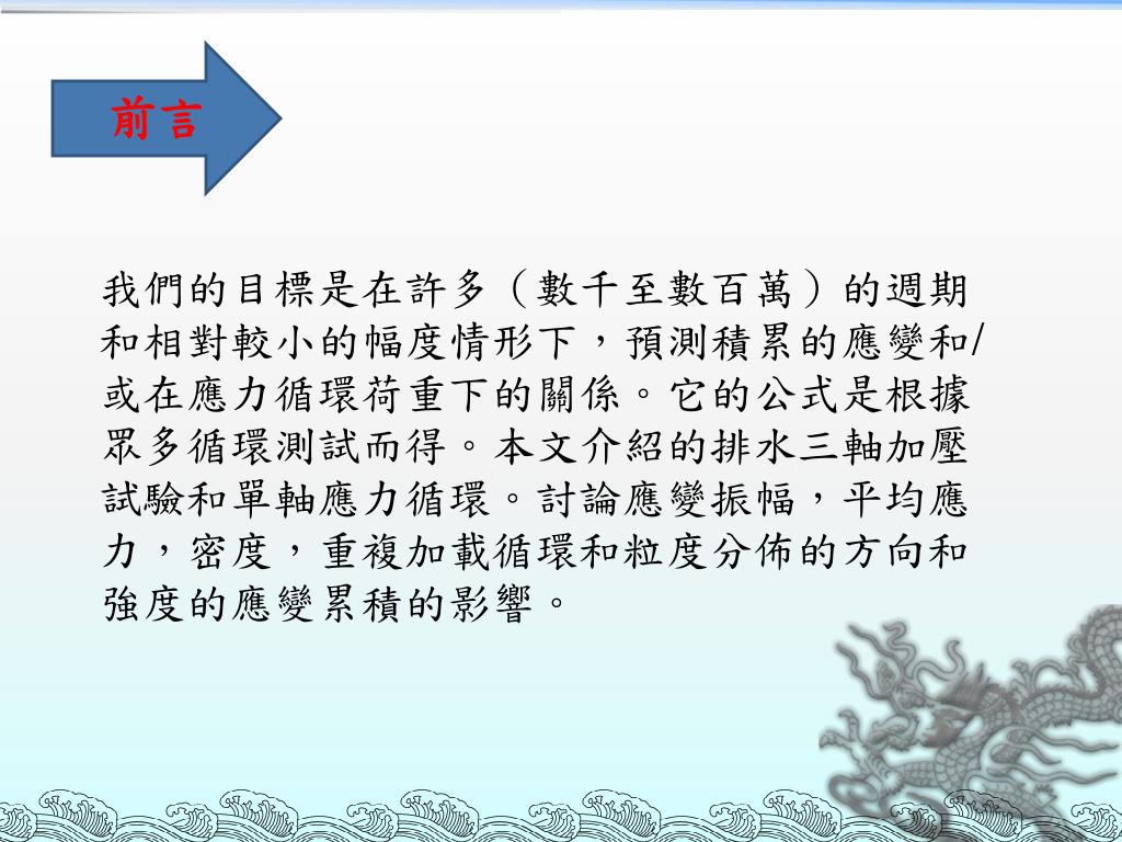 前言 我們的目標是在許多(數千至數百萬)的週期和相對較小的幅度情形下,預測積累的應變和/或在應力循環荷重下的關係。它的公式是根據眾多循環測試而得。本文介紹的排水三軸加壓試驗和單軸應力循環。討論應變振幅,平均應力,密度,重複加載循環和粒度分佈的方向和強度的應變累積的影響。