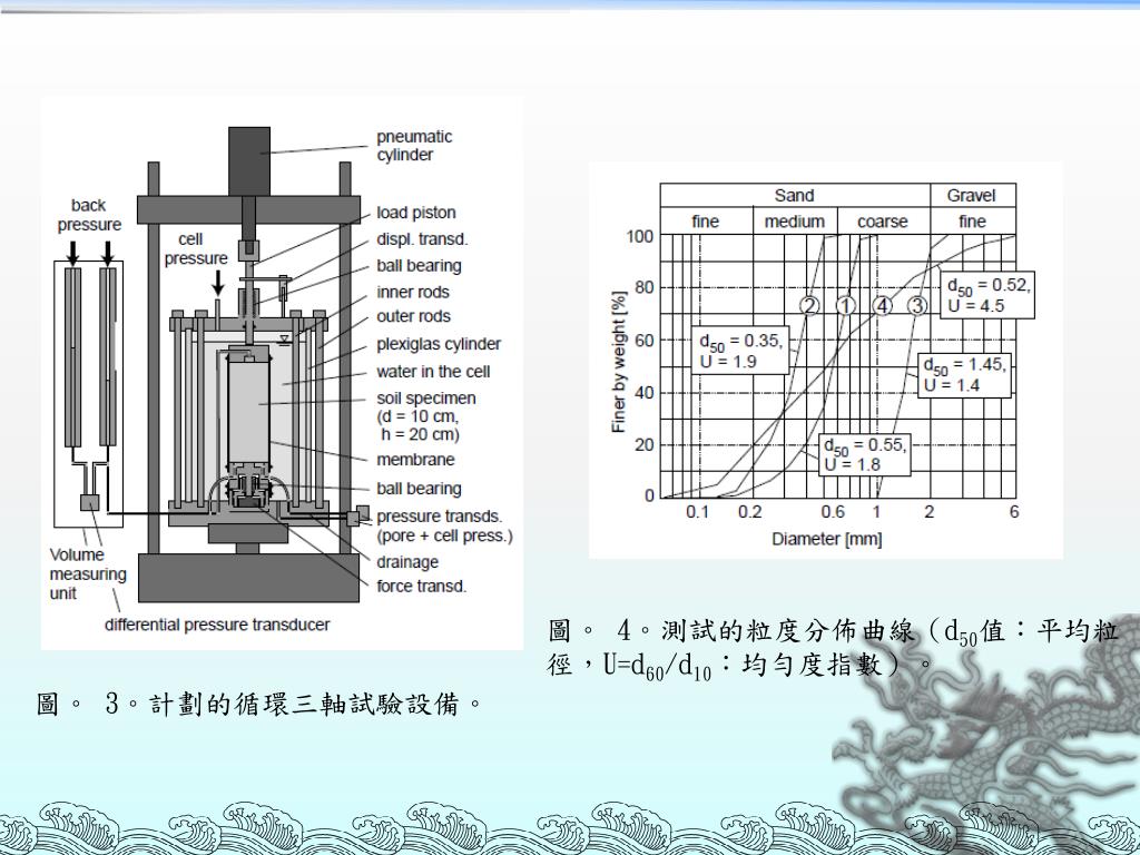 本次的三軸試驗違背了所謂的“共同夯實曲線”。本次的三軸試驗違背了所謂的“共同夯實曲線”。 積累率的增加會使平均主應力pav下降和平均應力比ηav增加。 增加孔隙率也會增加。 與加載頻率不相關(0.05赫茲<f<2赫茲)。 對於N>104累積應變εacc的增加速度超過了對數循環數目N。 累積強烈影響循環預加載重。 積累率在很大程度上相關於粒度分佈曲線。增加而減少平均顆粒粒徑(d50)被發現。級配良好的土壤夯實速度遠遠超過級配不良。
