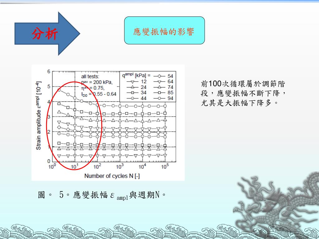 分析 密度的影響 初始孔隙比增加,應變振幅略微上升 圖。 21。應變振幅與初始孔隙比e0(平均值在105週期)。