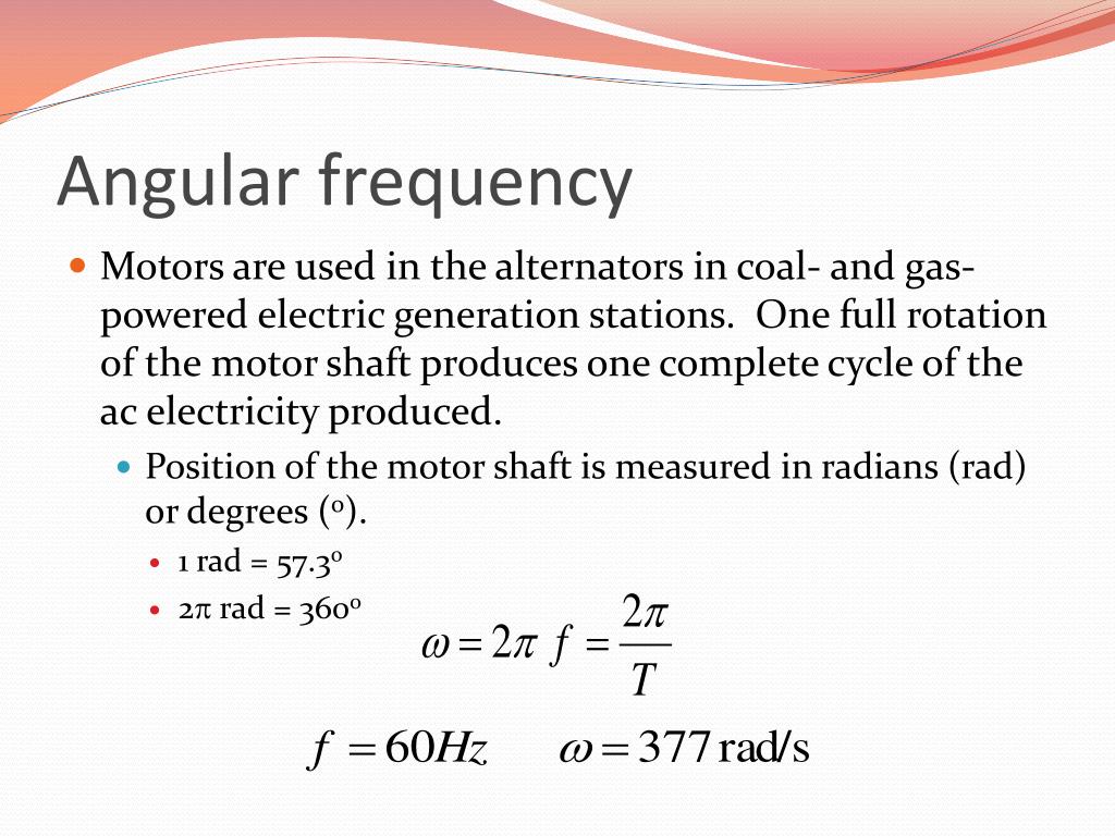Angular frequency • Motors are used in the alternators in coal- and gas-powered electric generation stations. One full rotation of the motor shaft produces one complete cycle of the ac electricity produced. • Position of the motor shaft is measured in radians (rad) or degrees (o). • 1 rad = 57.3o • 2p rad = 360o