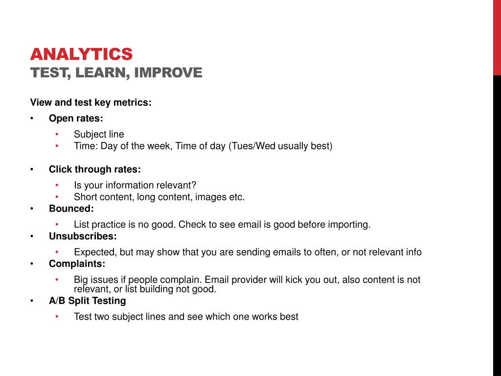 AnalyticsTest, Learn, Improve • View and test key metrics: • Open rates: • Subject line • Time: Day of the week, Time of day (Tues/Wed usually best) • Click through rates: • Is your information relevant? • Short content, long content, images etc. • Bounced: • List practice is no good. Check to see email is good before importing. • Unsubscribes: • Expected, but may show that you are sending emails to often, or not relevant info • Complaints: • Big issues if people complain. Email provider will kick you out, also content is not relevant, or list building not good. • A/B Split Testing • Test two subject lines and see which one works best