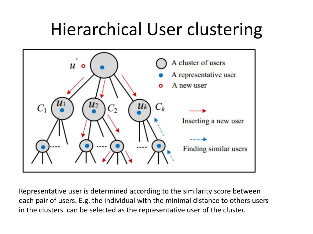 Hierarchical User clustering Representative user is determined according to the similarity score between each pairof users. E.g. the individual with the minimal distance to others users in the clusters can be selected as the representative user of the cluster.