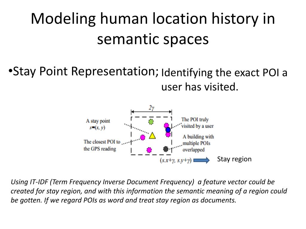 Modeling human location history in semantic spaces • Stay Point Representation; Identifying the exact POI a user has visited. Stay region Using IT-IDF (Term Frequency Inverse Document Frequency) a feature vector could be created for stay region, and with this information the semantic meaning of a region could be gotten. If we regard POIs as word and treat stay region as documents.