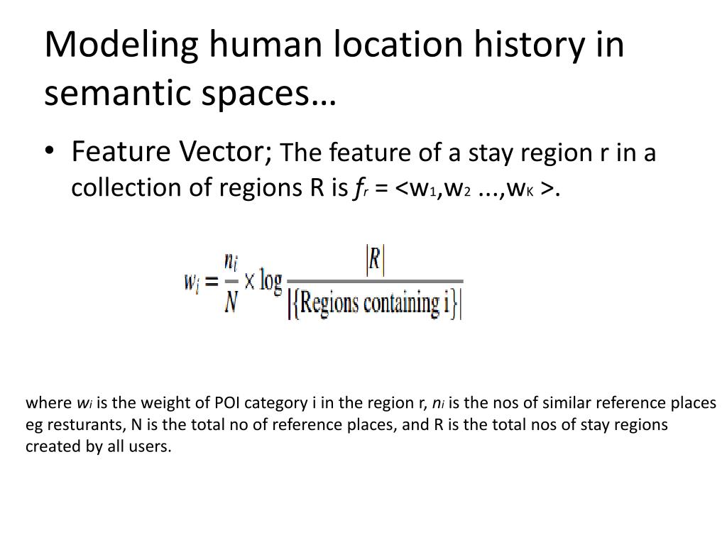 Modeling human location history in semantic spaces… • Feature Vector; The feature of a stay region r in a collection of regions R is fr = <w1,w2 ...,wK>. where wiis the weight of POI category i in the region r, niis the nos of similar reference places egresturants, N is the total no of reference places, and R is the total nos of stay regions created by all users.