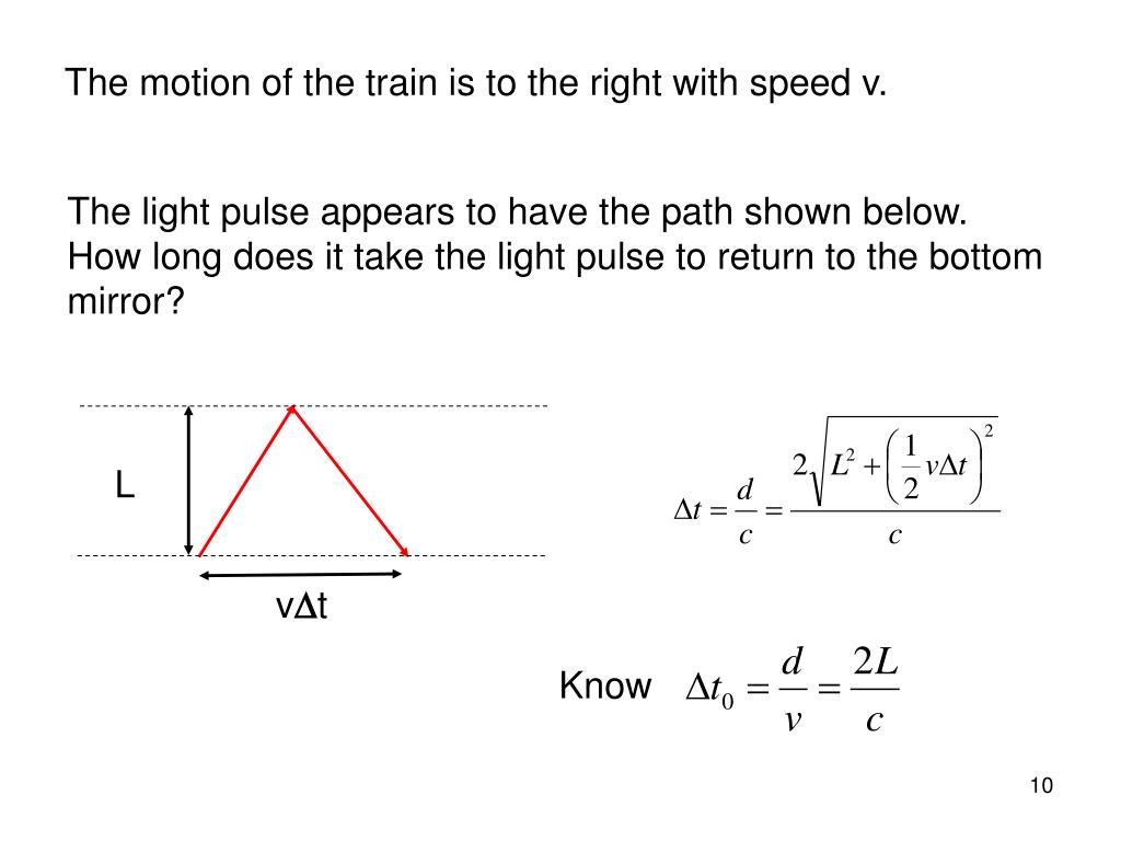 L vt The motion of the train is to the right with speed v. The light pulse appears to have the path shown below. How long does it take the light pulse to return to the bottom mirror? Know