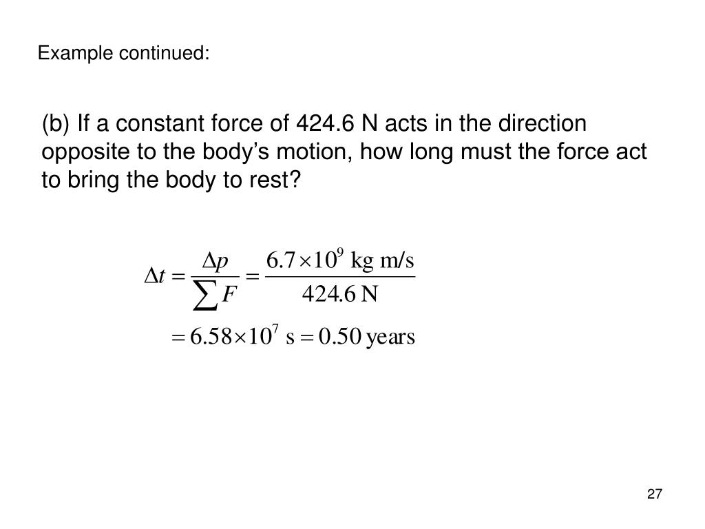 Example continued: (b) If a constant force of 424.6 N acts in the direction opposite to the body’s motion, how long must the force act to bring the body to rest?