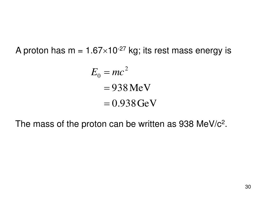 A proton has m = 1.6710-27 kg; its rest mass energy is The mass of the proton can be written as 938 MeV/c2.