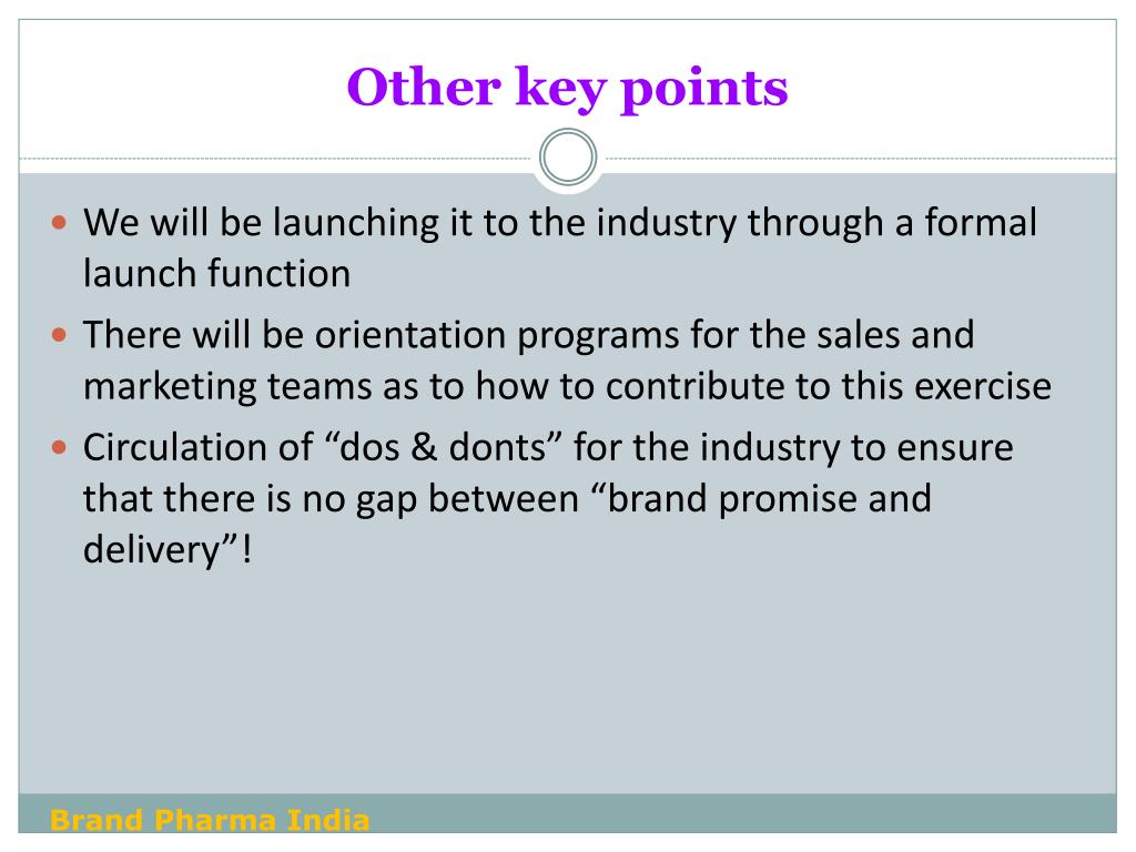 Other key points • We will be launching it to the industry through a formal launch function • There will be orientation programs for the sales and marketing teams as to how to contribute to this exercise • Circulation of “dos & donts” for the industry to ensure that there is no gap between “brand promise and delivery”! Brand Pharma India