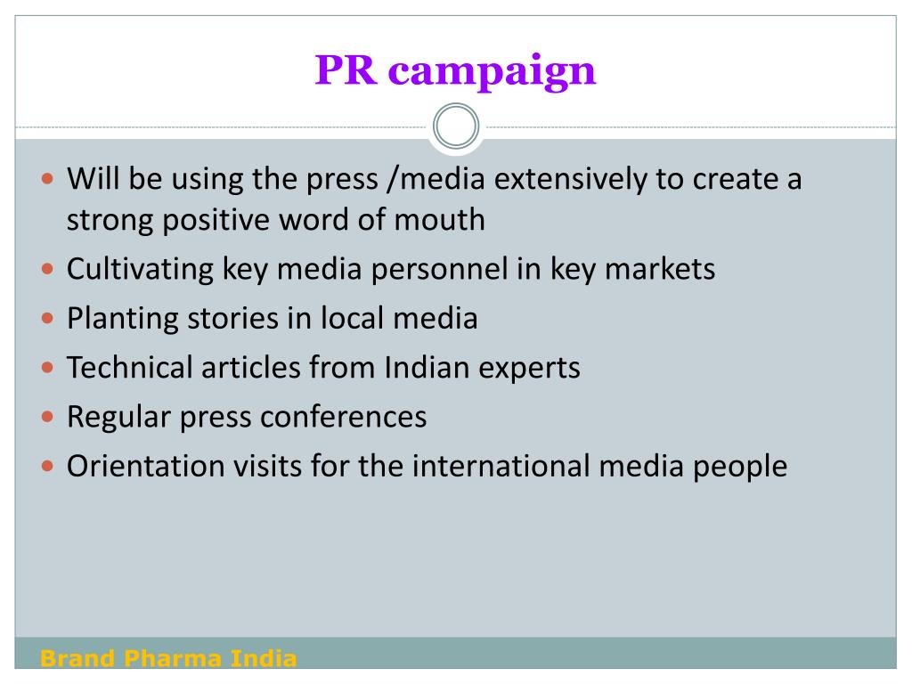 PR campaign • Will be using the press /media extensively to create a strong positive word of mouth • Cultivating key media personnel in key markets • Planting stories in local media • Technical articles from Indian experts • Regular press conferences • Orientation visits for the international media people Brand Pharma India