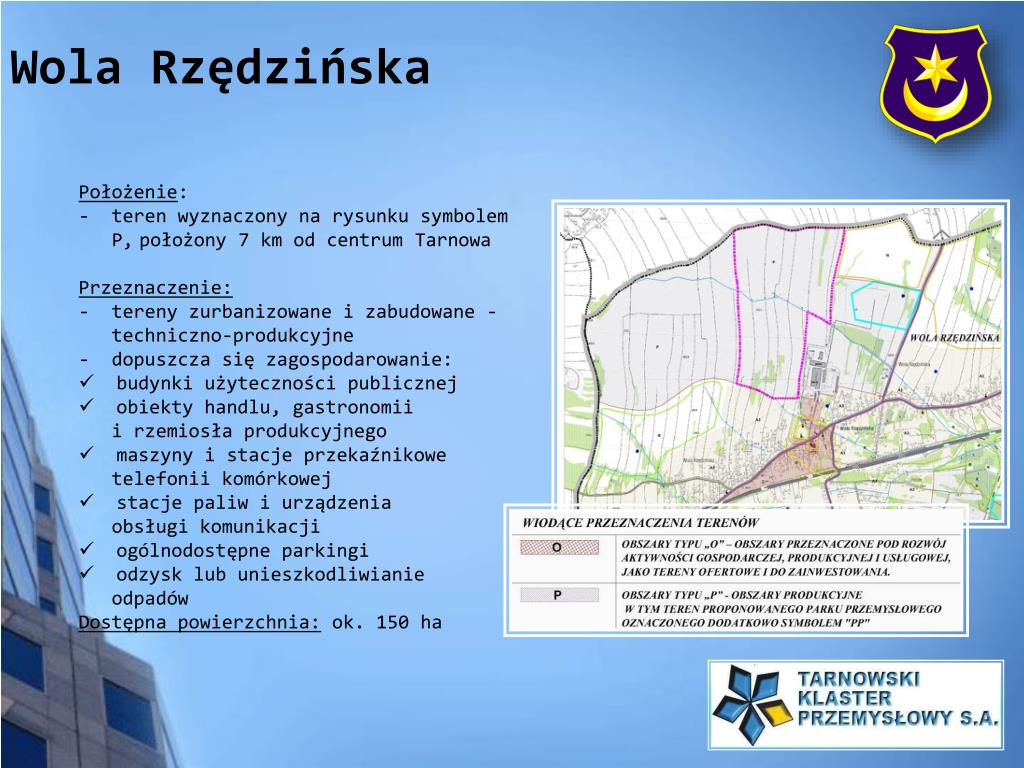 Wola Rzędzińska • Położenie: • - teren wyznaczony na rysunku symbolem P,położony 7 km od centrum Tarnowa • Przeznaczenie: • - tereny zurbanizowane i zabudowane - techniczno-produkcyjne • - dopuszcza się zagospodarowanie: • budynki użyteczności publicznej • obiekty handlu, gastronomii i rzemiosła produkcyjnego • maszyny i stacje przekaźnikowe telefonii komórkowej • stacje paliw i urządzenia obsługi komunikacji • ogólnodostępne parkingi • odzysk lub unieszkodliwianie odpadów • Dostępna powierzchnia: ok. 150 ha
