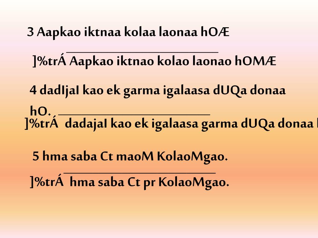 3 Aapkao iktnaa kolaa laonaa hOÆ ]%trÁ¯¯¯¯¯¯¯¯¯¯¯¯¯¯¯¯¯¯¯¯¯¯¯¯¯¯ Aapkao iktnao kolao laonao hOMÆ 4 dadIjaI kao ek garma igalaasa dUQa donaa hO. ]%trÁ¯¯¯¯¯¯¯¯¯¯¯¯¯¯¯¯¯¯¯¯¯¯¯¯¯¯ dadajaI kao ek igalaasa garma dUQa donaa hO. 5 hma saba Ct maoM KolaoMgao. ]%trÁ¯¯¯¯¯¯¯¯¯¯¯¯¯¯¯¯¯¯¯¯¯¯¯¯¯¯ hma saba Ct pr KolaoMgao.