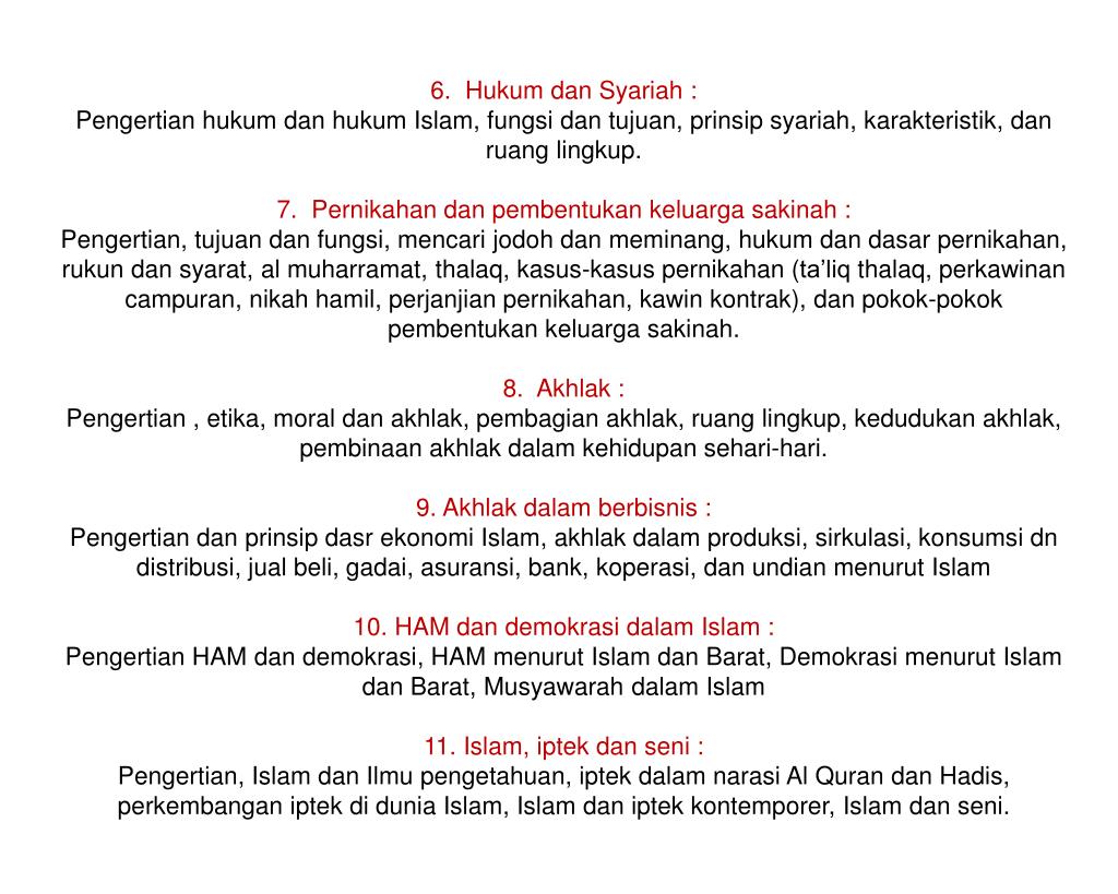 6. HukumdanSyariah :Pengertianhukumdanhukum Islam, fungsidantujuan, prinsipsyariah, karakteristik, danruanglingkup.7. Pernikahandanpembentukankeluargasakinah :Pengertian, tujuandanfungsi, mencarijodohdanmeminang, hukumdandasarpernikahan, rukundansyarat, al muharramat, thalaq, kasus-kasuspernikahan (ta’liqthalaq, perkawinancampuran, nikahhamil, perjanjianpernikahan, kawinkontrak), danpokok-pokokpembentukankeluargasakinah.8. Akhlak :Pengertian , etika, moral danakhlak, pembagianakhlak, ruanglingkup, kedudukanakhlak, pembinaanakhlakdalamkehidupansehari-hari.9. Akhlakdalamberbisnis :Pengertiandanprinsipdasrekonomi Islam, akhlakdalamproduksi, sirkulasi, konsumsidndistribusi, jualbeli, gadai, asuransi, bank, koperasi, danundianmenurut Islam10. HAM dandemokrasidalam Islam :Pengertian HAM dandemokrasi, HAM menurut Islam danBarat, Demokrasimenurut Islam danBarat, Musyawarahdalam Islam11. Islam, iptekdanseni :Pengertian, Islam danIlmupengetahuan, iptekdalamnarasi Al QurandanHadis, perkembanganiptekdidunia Islam, Islam daniptekkontemporer, Islam danseni.