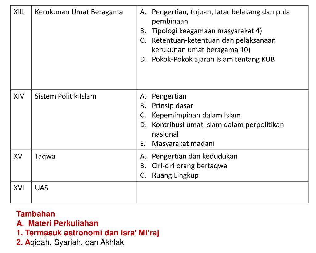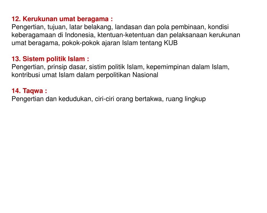 12. Kerukunan umat beragama :Pengertian, tujuan, latar belakang, landasan dan pola pembinaan, kondisi keberagamaan di Indonesia, ktentuan-ketentuan dan pelaksanaan kerukunan umat beragama, pokok-pokok ajaran Islam tentang KUB13. Sistem politik Islam :Pengertian, prinsip dasar, sistim politik Islam, kepemimpinan dalam Islam, kontribusi umat Islam dalam perpolitikan Nasional14. Taqwa :Pengertian dan kedudukan, ciri-ciri orang bertakwa, ruang lingkup