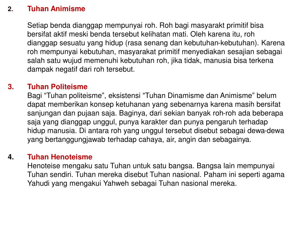 2.TuhanAnimisme Setiap benda dianggap mempunyai roh. Roh bagi masyarakt primitif bisa bersifat aktif meski benda tersebut kelihatan mati. Oleh karena itu, roh dianggap sesuatu yang hidup (rasa senang dan kebutuhan-kebutuhan). Karena roh mempunyai kebutuhan, masyarakat primitif menyediakan sesajian sebagai salah satu wujud memenuhi kebutuhan roh, jika tidak, manusia bisa terkena dampak negatif dari roh tersebut. 3. Tuhan Politeisme Bagi “Tuhan politeisme”, eksistensi “Tuhan Dinamisme dan Animisme” belum dapat memberikan konsep ketuhanan yang sebenarnya karena masih bersifat sanjungan dan pujaan saja. Baginya, dari sekian banyak roh-roh ada beberapa saja yang dianggap unggul, punya karakter dan punya pengaruh terhadap hidup manusia. Di antara roh yang unggul tersebut disebut sebagai dewa-dewa yang bertanggungjawab terhadap cahaya, air, angin dan sebagainya. 4. Tuhan Henoteisme HenoteisemengakusatuTuhanuntuksatubangsa. Bangsa lain mempunyaiTuhansendiri. TuhanmerekadisebutTuhannasional. Pahaminiseperti agama Yahudi yang mengakui Yahweh sebagaiTuhannasionalmereka.