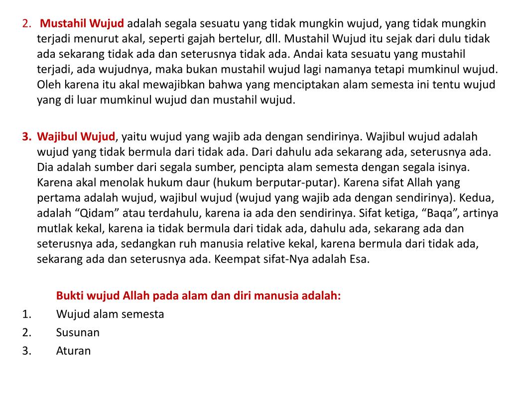 2. MustahilWujudadalahsegalasesuatu yang tidakmungkinwujud, yang tidakmungkinterjadimenurutakal, sepertigajahbertelur, dll. MustahilWujuditusejakdaridulutidakadasekarangtidakadadanseterusnyatidakada. Andaikatasesuatu yang mustahilterjadi, adawujudnya, makabukanmustahilwujudlaginamanyatetapimumkinulwujud. Olehkarenaituakalmewajibkanbahwa yang menciptakanalamsemestainitentuwujud yang diluarmumkinulwujuddanmustahilwujud. • WajibulWujud, yaituwujud yang wajibadadengansendirinya. Wajibulwujudadalahwujud yang tidakbermuladaritidakada. Dari dahuluadasekarangada, seterusnyaada. Diaadalahsumberdarisegalasumber, penciptaalamsemestadengansegalaisinya. Karenaakalmenolakhukumdaur (hukumberputar-putar). Karenasifat Allah yang pertamaadalahwujud, wajibulwujud (wujud yang wajibadadengansendirinya). Kedua, adalah “Qidam” atauterdahulu, karenaiaada den sendirinya. Sifatketiga, “Baqa”, artinyamutlakkekal, karenaiatidakbermuladaritidakada, dahuluada, sekarangadadanseterusnyaada, sedangkanruhmanusia relative kekal, karenabermuladaritidakada, sekarangadadanseterusnyaada. Keempatsifat-NyaadalahEsa. Buktiwujud Allah padaalamdandirimanusiaadalah: • Wujudalamsemesta • Susunan • Aturan