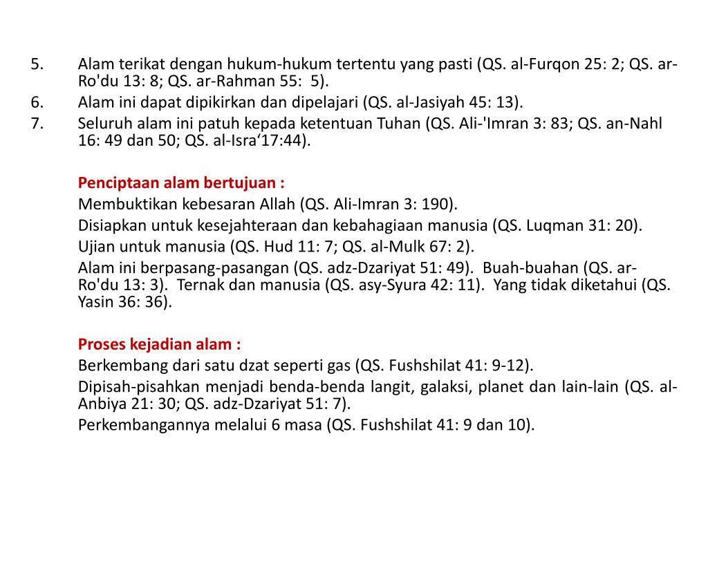 5. Alamterikatdenganhukum-hukumtertentu yang pasti (QS. al-Furqon 25: 2; QS. ar-Ro'du 13: 8; QS. ar-Rahman 55: 5). 6. Alaminidapatdipikirkandandipelajari (QS. al-Jasiyah 45: 13). • SeluruhalaminipatuhkepadaketentuanTuhan (QS. Ali-'Imran 3: 83; QS. an-Nahl 16: 49 dan 50; QS. al-Isra‘17:44). Penciptaanalambertujuan : Membuktikankebesaran Allah (QS. Ali-Imran 3: 190). Disiapkanuntukkesejahteraandankebahagiaanmanusia (QS. Luqman 31: 20). Ujianuntukmanusia (QS. Hud 11: 7; QS. al-Mulk 67: 2). Alaminiberpasang-pasangan (QS. adz-Dzariyat 51: 49). Buah-buahan (QS. ar-Ro'du 13: 3). Ternakdanmanusia (QS. asy-Syura 42: 11). Yang tidakdiketahui (QS. Yasin 36: 36). Proseskejadianalam : Berkembangdarisatudzatseperti gas (QS. Fushshilat 41: 9-12). Dipisah-pisahkanmenjadibenda-bendalangit, galaksi, planet dan lain-lain (QS. al-Anbiya 21: 30; QS. adz-Dzariyat 51: 7). Perkembangannyamelalui 6 masa (QS. Fushshilat 41: 9 dan 10).