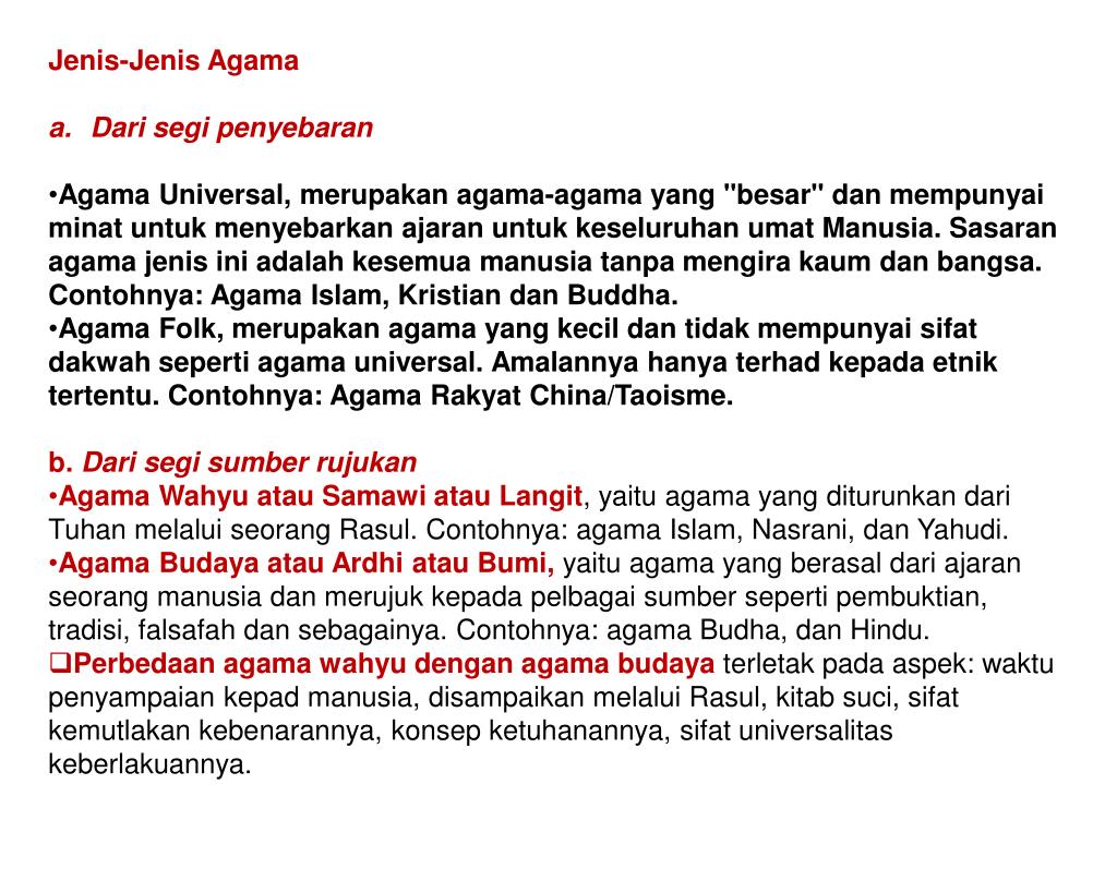 Jenis-Jenis Agama • Dari segi penyebaran • Agama Universal, merupakan agama-agama yang "besar" dan mempunyai minat untuk menyebarkan ajaran untuk keseluruhan umat Manusia. Sasaran agama jenis ini adalah kesemua manusia tanpa mengira kaum dan bangsa. Contohnya: Agama Islam, Kristian dan Buddha. • Agama Folk, merupakan agama yang kecil dan tidak mempunyai sifat dakwah seperti agama universal. Amalannya hanya terhad kepada etnik tertentu. Contohnya: Agama Rakyat China/Taoisme. • b. Dari segi sumber rujukan • Agama WahyuatauSamawiatauLangit, yaitu agama yang diturunkandariTuhanmelaluiseorangRasul. Contohnya: agama Islam, Nasrani, danYahudi. • Agama Budaya atau Ardhi atau Bumi, yaitu agama yang berasal dari ajaran seorang manusia dan merujuk kepada pelbagai sumber seperti pembuktian, tradisi, falsafah dan sebagainya. Contohnya: agama Budha, dan Hindu. • Perbedaan agama wahyudengan agama budayaterletakpadaaspek: waktupenyampaiankepadmanusia, disampaikanmelaluiRasul, kitabsuci, sifatkemutlakankebenarannya, konsepketuhanannya, sifatuniversalitaskeberlakuannya.