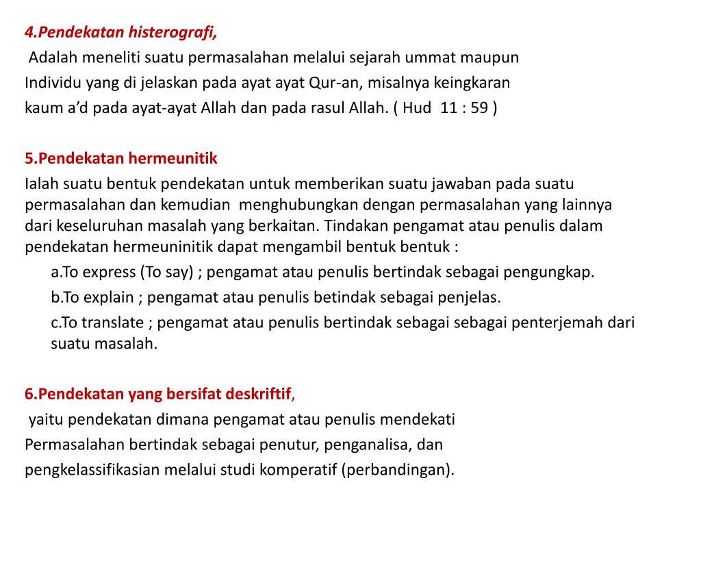 4.Pendekatan histerografi, Adalah meneliti suatu permasalahan melalui sejarah ummat maupun Individuyang di jelaskan pada ayat ayat Qur-an, misalnya keingkaran kaum a’d pada ayat-ayat Allah dan pada rasul Allah. ( Hud 11 : 59 ) 5.Pendekatan hermeunitik Ialah suatu bentuk pendekatan untuk memberikan suatu jawaban pada suatu permasalahan dan kemudian menghubungkan dengan permasalahan yang lainnya dari keseluruhan masalah yang berkaitan. Tindakan pengamat atau penulis dalam pendekatan hermeuninitik dapat mengambil bentuk bentuk : a.To express (To say) ; pengamat atau penulis bertindak sebagai pengungkap. b.To explain ; pengamat atau penulis betindak sebagai penjelas. c.To translate ; pengamat atau penulis bertindak sebagai sebagai penterjemah dari suatu masalah. 6.Pendekatan yang bersifat deskriftif, yaitu pendekatan dimana pengamat atau penulis mendekati Permasalahanbertindak sebagai penutur, penganalisa, dan pengkelassifikasian melalui studi komperatif (perbandingan).