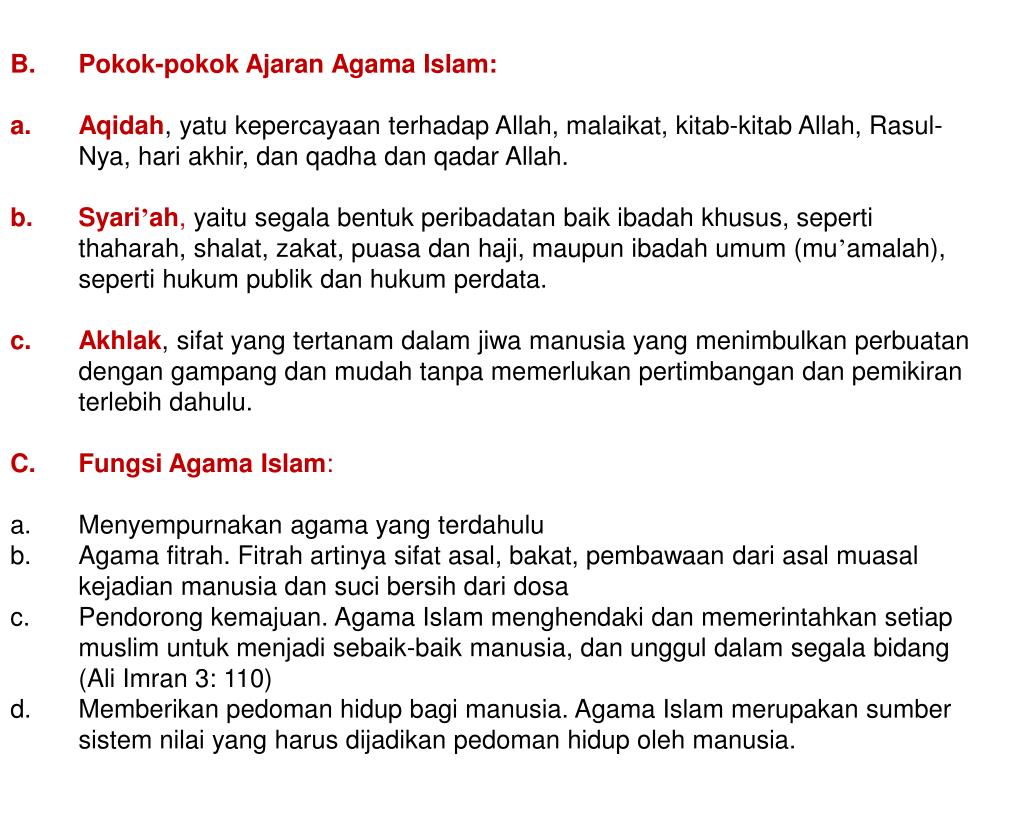 B. Pokok-pokok Ajaran Agama Islam: Aqidah, yatu kepercayaan terhadap Allah, malaikat, kitab-kitab Allah, Rasul-Nya, hari akhir, dan qadha dan qadar Allah. Syari’ah, yaitu segala bentuk peribadatan baik ibadah khusus, seperti thaharah, shalat, zakat, puasa dan haji, maupun ibadah umum (mu’amalah), seperti hukum publik dan hukum perdata. Akhlak, sifat yang tertanam dalam jiwa manusia yang menimbulkan perbuatan dengan gampang dan mudah tanpa memerlukan pertimbangan dan pemikiran terlebih dahulu. C. Fungsi Agama Islam: Menyempurnakan agama yang terdahulu Agama fitrah. Fitrah artinya sifat asal, bakat, pembawaan dari asal muasal kejadian manusia dan suci bersih dari dosa Pendorong kemajuan. Agama Islam menghendaki dan memerintahkan setiap muslim untuk menjadi sebaik-baik manusia, dan unggul dalam segala bidang (Ali Imran 3: 110) Memberikan pedoman hidup bagi manusia. Agama Islam merupakan sumber sistem nilai yang harus dijadikan pedoman hidup oleh manusia.