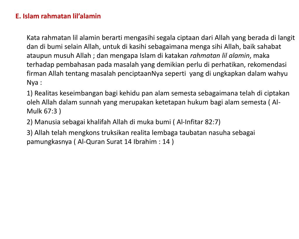 E. Islam rahmatan lil’alamin Kata rahmatan lil alamin berarti mengasihi segala ciptaan dari Allah yang berada di langit dan di bumi selain Allah, untuk di kasihi sebagaimana menga sihi Allah, baik sahabat ataupun musuh Allah ; dan mengapa Islam di katakan rahmatan lil alamin, maka terhadap pembahasan pada masalah yang demikian perlu di perhatikan, rekomendasi firman Allah tentang masalah penciptaanNya seperti yang di ungkapkan dalam wahyu Nya : 1) Realitas keseimbangan bagi kehidu pan alam semesta sebagaimana telah di ciptakan oleh Allah dalam sunnah yang merupakan ketetapan hukum bagi alam semesta ( Al-Mulk 67:3 ) 2) Manusia sebagai khalifah Allah di muka bumi ( Al-Infitar 82:7) 3) Allah telah mengkons truksikan realita lembaga taubatan nasuha sebagai pamungkasnya ( Al-Quran Surat 14 Ibrahim : 14 )