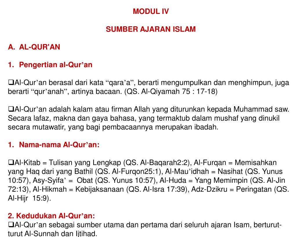 MODUL IV • SUMBER AJARAN ISLAM • AL-QUR'AN • Pengertian al-Qur’an • Al-Qur’anberasaldarikata“qara’a”, berartimengumpulkandanmenghimpun, jugaberarti“qur’anah”, artinyabacaan. (QS. Al-Qiyamah 75 : 17-18) • Al-Qur’anadalahkalamataufirman Allah yang diturunkankepada Muhammad saw. Secaralafaz, maknadangayabahasa, yang termaktubdalammushaf yang dinukilsecaramutawatir, yang bagipembacaannyamerupakanibadah. • Nama-nama Al-Qur’an: • Al-Kitab = Tulisan yang Lengkap (QS. Al-Baqarah2:2), Al-Furqan = Memisahkan yang Haqdari yang Bathil (QS. Al-Furqon25:1), Al-Mau’idhah = Nasihat (QS. Yunus 10:57), Asy-Syifa’ =Obat (QS. Yunus 10:57), Al-Huda = Yang Memimpin (QS. Al-Jin 72:13), Al-Hikmah = Kebijaksanaan (QS. Al-Isra 17:39), Adz-Dzikru = Peringatan (QS. Al-Hijr 15:9). 2. Kedudukan Al-Qur’an: • Al-Qur’ansebagaisumberutamadanpertamadariseluruhajaranIsam, berturut-turut Al-SunnahdanIjtihad.