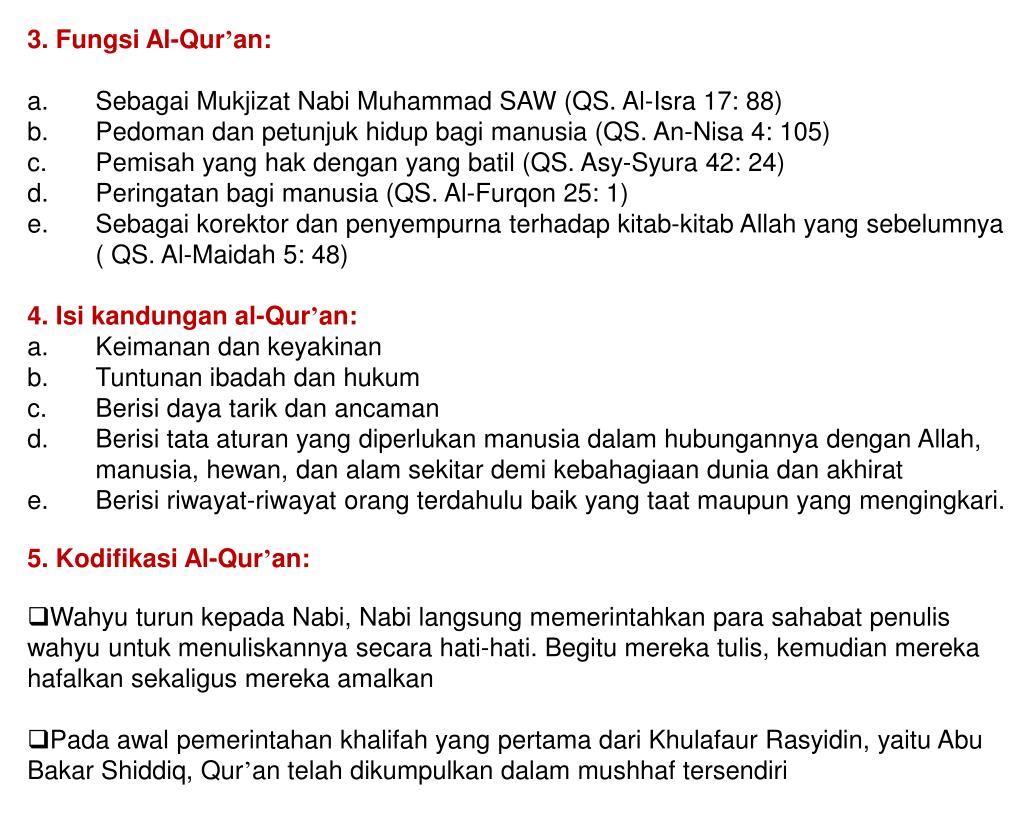 3. Fungsi Al-Qur’an: • SebagaiMukjizatNabi Muhammad SAW (QS. Al-Isra 17: 88) • Pedomandanpetunjukhidupbagimanusia (QS. An-Nisa 4: 105) • Pemisah yang hakdengan yang batil (QS. Asy-Syura 42: 24) • Peringatanbagimanusia (QS. Al-Furqon 25: 1) • Sebagaikorektordanpenyempurnaterhadapkitab-kitab Allah yang sebelumnya ( QS. Al-Maidah 5: 48) 4. Isikandungan al-Qur’an: • Keimanandankeyakinan • Tuntunanibadahdanhukum • Berisidayatarikdanancaman • Berisitataaturan yang diperlukanmanusiadalamhubungannyadengan Allah, manusia, hewan, danalamsekitardemikebahagiaanduniadanakhirat • Berisiriwayat-riwayatorangterdahulubaik yang taatmaupun yang mengingkari. 5. Kodifikasi Al-Qur’an: • WahyuturunkepadaNabi, Nabilangsungmemerintahkanparasahabatpenuliswahyuuntukmenuliskannyasecarahati-hati. Begitumerekatulis, kemudianmerekahafalkansekaligusmerekaamalkan • Padaawalpemerintahankhalifah yang pertamadariKhulafaurRasyidin, yaitu Abu BakarShiddiq, Qur’antelahdikumpulkandalammushhaftersendiri