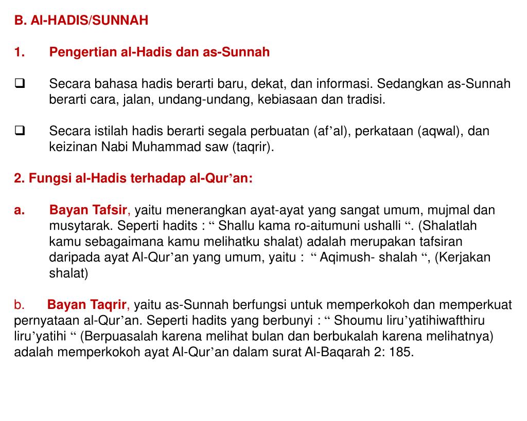 B. Al-HADIS/SUNNAH • Pengertian al-Hadisdan as-Sunnah • Secarabahasahadisberartibaru, dekat, daninformasi. Sedangkan as-Sunnahberarticara, jalan, undang-undang, kebiasaandantradisi. • Secaraistilahhadisberartisegalaperbuatan (af’al), perkataan (aqwal), dankeizinanNabi Muhammad saw (taqrir). 2. Fungsi al-Hadisterhadap al-Qur’an: • BayanTafsir, yaitumenerangkanayat-ayat yang sangatumum, mujmaldanmusytarak. Sepertihadits : “Shallukamaro-aitumuniushalli“. (Shalatlahkamusebagaimanakamumelihatkushalat) adalahmerupakantafsirandaripadaayat Al-Qur’an yang umum, yaitu :“Aqimush- shalah“, (Kerjakanshalat) b. BayanTaqrir, yaitu as-Sunnahberfungsiuntukmemperkokohdanmemperkuatpernyataan al-Qur’an. Sepertihadits yang berbunyi : “Shoumuliru’yatihiwafthiruliru’yatihi“ (Berpuasalahkarenamelihatbulandanberbukalahkarenamelihatnya) adalahmemperkokohayat Al-Qur’an dalamsurat Al-Baqarah 2: 185.