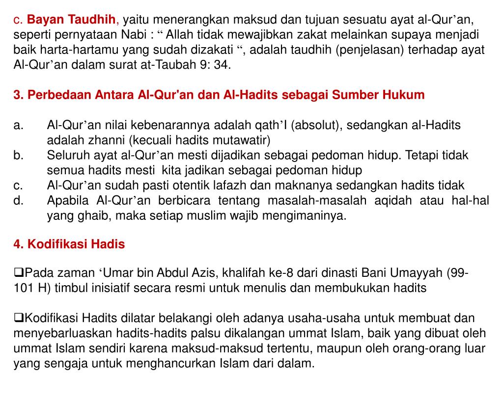 c. BayanTaudhih, yaitumenerangkanmaksuddantujuansesuatuayat al-Qur’an, sepertipernyataanNabi : “ Allah tidakmewajibkanzakatmelainkansupayamenjadibaikharta-hartamu yang sudahdizakati“, adalahtaudhih (penjelasan) terhadapayat Al-Qur’an dalamsurat at-Taubah 9: 34. 3. PerbedaanAntara Al-Qur'andan Al-HaditssebagaiSumberHukum • Al-Qur’annilaikebenarannyaadalahqath’I (absolut), sedangkan al-Haditsadalahzhanni (kecualihaditsmutawatir) • Seluruhayat al-Qur’anmestidijadikansebagaipedomanhidup. Tetapitidaksemuahaditsmestikitajadikansebagaipedomanhidup • Al-Qur’ansudahpastiotentiklafazhdanmaknanyasedangkanhaditstidak • Apabila Al-Qur’anberbicaratentangmasalah-masalahaqidahatauhal-hal yang ghaib, makasetiapmuslimwajibmengimaninya. 4. KodifikasiHadis • Padazaman‘Umar bin Abdul Azis, khalifah ke-8 daridinastiBaniUmayyah (99-101 H) timbulinisiatifsecararesmiuntukmenulisdanmembukukanhadits • KodifikasiHaditsdilatarbelakangiolehadanyausaha-usahauntukmembuatdanmenyebarluaskanhadits-haditspalsudikalanganummat Islam, baik yang dibuatolehummat Islam sendirikarenamaksud-maksudtertentu, maupunolehorang-orangluar yang sengajauntukmenghancurkan Islam daridalam.
