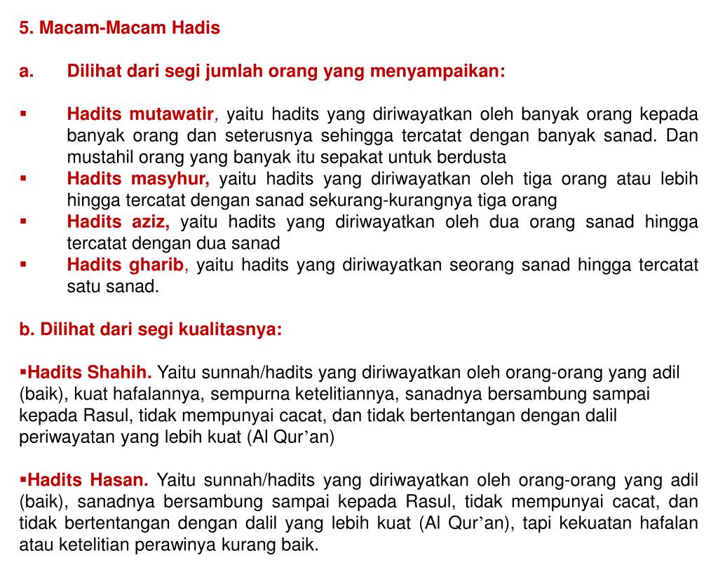 Hadits Dha’if. Yaitu sunnah/hadits lemah karena perawinya tidak adil, terputussanadnya, punya cacat, bertentangan dengan dalil atau periwayatan yanglebih kuat, atau cacat lainnya • Hadits Maudhu’. Yaitu sunnah/hadits yang dibuat oleh seseorang (karangan sendiri)kemudian dikatakan sebagai perkataan atau perbuatan Rasulullah saw. c. Dilihat dari segi diterima atau ditolaknya: • Hadis Maqbul, ialah hadis yang diterima dan dapat dijadikan hujjah/sumber hukum • Hadis Mardud,ialah hadis yang ditolak dan tidak boleh dijadikan sumber hukum. d. Dilihat dari siapa yang berperan dalam berbuat atau bersabda: • Hadis Marfu’, ialah hadis yang disandarkan kepada Nabi saw • Hadis Mauquf, ialah hadis yang disandarkan kepada sahabat • Hadis Maqthu’, ialah hadis yang disandarkan kepada tabi’in. 6. Kitab-kitab hadis yang dinilai terbaik: • Ash-Shahih Bukhari; Ash-Shahih Muslim; Ash-Sunan Abu-Dawud; As-Sunan Nasai ; As-Sunan Tirmidzi; As-Sunan Ibnu Majah ; dan Al-Musnad Imam Ahmad.