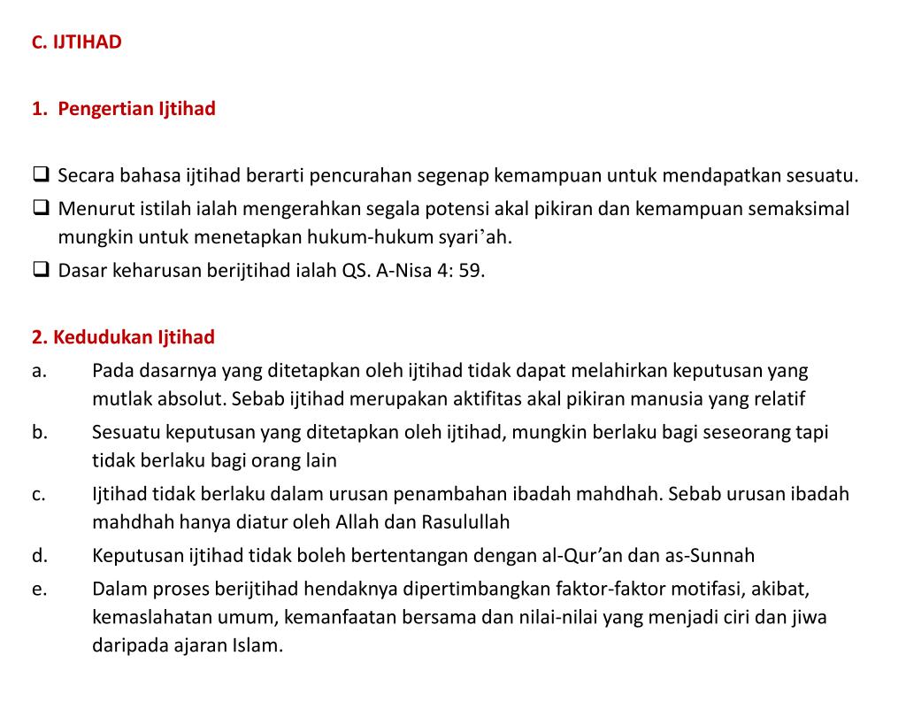 C. IJTIHAD • PengertianIjtihad • Secarabahasaijtihadberartipencurahansegenapkemampuanuntukmendapatkansesuatu. • Menurutistilahialahmengerahkansegalapotensiakalpikirandankemampuansemaksimalmungkinuntukmenetapkanhukum-hukumsyari’ah. • Dasarkeharusanberijtihadialah QS. A-Nisa 4: 59. 2. KedudukanIjtihad • Padadasarnya yang ditetapkanolehijtihadtidakdapatmelahirkankeputusan yang mutlakabsolut. Sebabijtihadmerupakanaktifitasakalpikiranmanusia yang relatif • Sesuatukeputusan yang ditetapkanolehijtihad, mungkinberlakubagiseseorangtapitidakberlakubagiorang lain • Ijtihadtidakberlakudalamurusanpenambahanibadahmahdhah. Sebaburusanibadahmahdhahhanyadiaturoleh Allah danRasulullah • Keputusanijtihadtidakbolehbertentangandengan al-Qur’andan as-Sunnah • Dalamprosesberijtihadhendaknyadipertimbangkanfaktor-faktormotifasi, akibat, kemaslahatanumum, kemanfaatanbersamadannilai-nilai yang menjadiciridanjiwadaripadaajaran Islam.