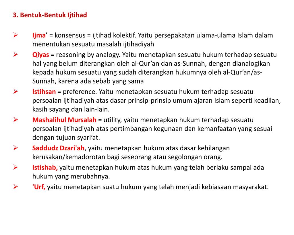 3. Bentuk-BentukIjtihad • Ijma’ = konsensus = ijtihadkolektif. Yaitupersepakatanulama-ulama Islam dalammenentukansesuatumasalahijtihadiyah • Qiyas= reasoning by analogy. Yaitumenetapkansesuatuhukumterhadapsesuatuhal yang belumditerangkanoleh al-Qur’andan as-Sunnah, dengandianalogikankepadahukumsesuatu yang sudahditerangkanhukumnyaoleh al-Qur’an/as-Sunnah, karenaadasebab yang sama • Istihsan= preference. Yaitumenetapkansesuatuhukumterhadapsesuatupersoalanijtihadiyahatasdasarprinsip-prinsipumumajaran Islam sepertikeadilan, kasihsayangdan lain-lain. • MashalihulMursalah= utility, yaitumenetapkanhukumterhadapsesuatupersoalanijtihadiyahataspertimbangankegunaandankemanfaatan yang sesuaidengantujuansyari’at. • SaddudzDzari'ah, yaitumenetapkanhukumatasdasarkehilangankerusakan/kemadorotanbagiseseorangatausegolonganorang. • Istishab,yaitumenetapkanhukumatashukum yang telahberlakusampaiadahukum yang merubahnya. • 'Urf,yaitumenetapkansuatuhukum yang telahmenjadikebiasaanmasyarakat.
