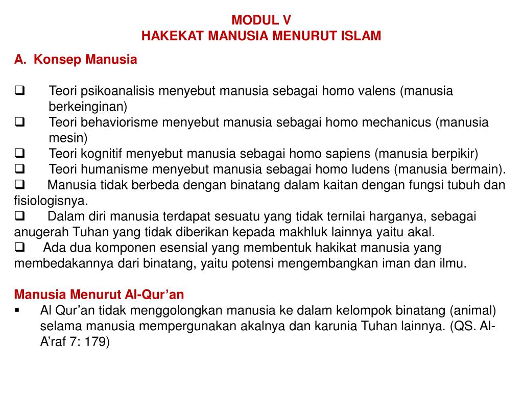 MODUL V • HAKEKAT MANUSIA MENURUT ISLAM • KonsepManusia • Teoripsikoanalisismenyebutmanusiasebagai homo valens (manusiaberkeinginan) • Teoribehaviorismemenyebutmanusiasebagai homo mechanicus (manusiamesin) • Teorikognitifmenyebutmanusiasebagai homo sapiens (manusiaberpikir) • Teorihumanismemenyebutmanusiasebagai homo ludens (manusiabermain). • Manusiatidakberbedadenganbinatangdalamkaitandenganfungsitubuhdanfisiologisnya. • Dalamdirimanusiaterdapatsesuatu yang tidakternilaiharganya, sebagaianugerahTuhan yang tidakdiberikankepadamakhluklainnyayaituakal. • Adaduakomponenesensial yang membentukhakikatmanusia yang membedakannyadaribinatang, yaitupotensimengembangkanimandanilmu. • ManusiaMenurut Al-Qur’an • Al Qur’antidakmenggolongkanmanusiakedalamkelompokbinatang (animal) selamamanusiamempergunakanakalnyadankaruniaTuhanlainnya. (QS. Al-A’raf 7: 179)