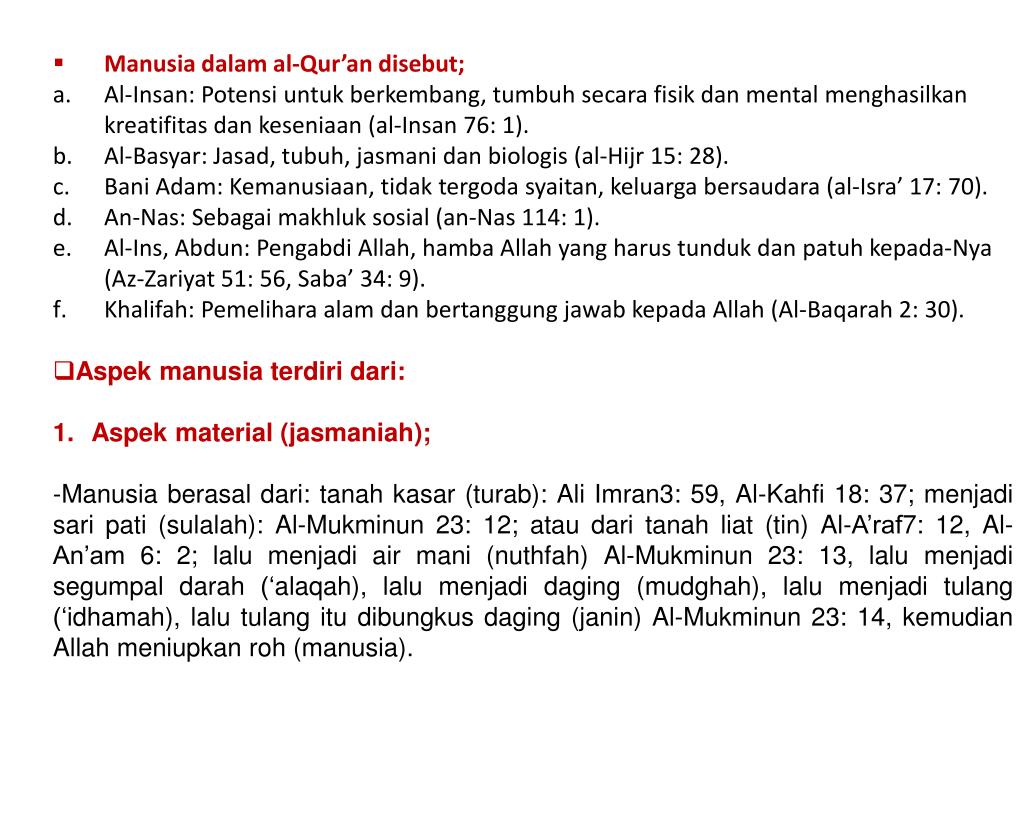 Manusiadalam al-Qur’andisebut; • Al-Insan: Potensiuntukberkembang, tumbuhsecarafisikdan mental menghasilkankreatifitasdankeseniaan (al-Insan 76: 1). • Al-Basyar: Jasad, tubuh, jasmanidanbiologis (al-Hijr 15: 28). • Bani Adam: Kemanusiaan, tidaktergodasyaitan, keluargabersaudara (al-Isra’ 17: 70). • An-Nas: Sebagaimakhluksosial (an-Nas 114: 1). • Al-Ins, Abdun: Pengabdi Allah, hamba Allah yang harustundukdanpatuhkepada-Nya (Az-Zariyat 51: 56, Saba’ 34: 9). • Khalifah: Pemeliharaalamdanbertanggungjawabkepada Allah (Al-Baqarah 2: 30). • Aspekmanusiaterdiridari: • Aspek material (jasmaniah); • Manusiaberasaldari: tanahkasar (turab): Ali Imran3: 59, Al-Kahfi 18: 37; menjadi sari pati (sulalah): Al-Mukminun 23: 12; ataudaritanahliat (tin) Al-A’raf7: 12, Al-An’am 6: 2; lalumenjadi air mani (nuthfah) Al-Mukminun 23: 13, lalumenjadisegumpaldarah (‘alaqah), lalumenjadidaging (mudghah), lalumenjaditulang (‘idhamah), lalutulangitudibungkusdaging (janin) Al-Mukminun 23: 14, kemudian Allah meniupkanroh (manusia).