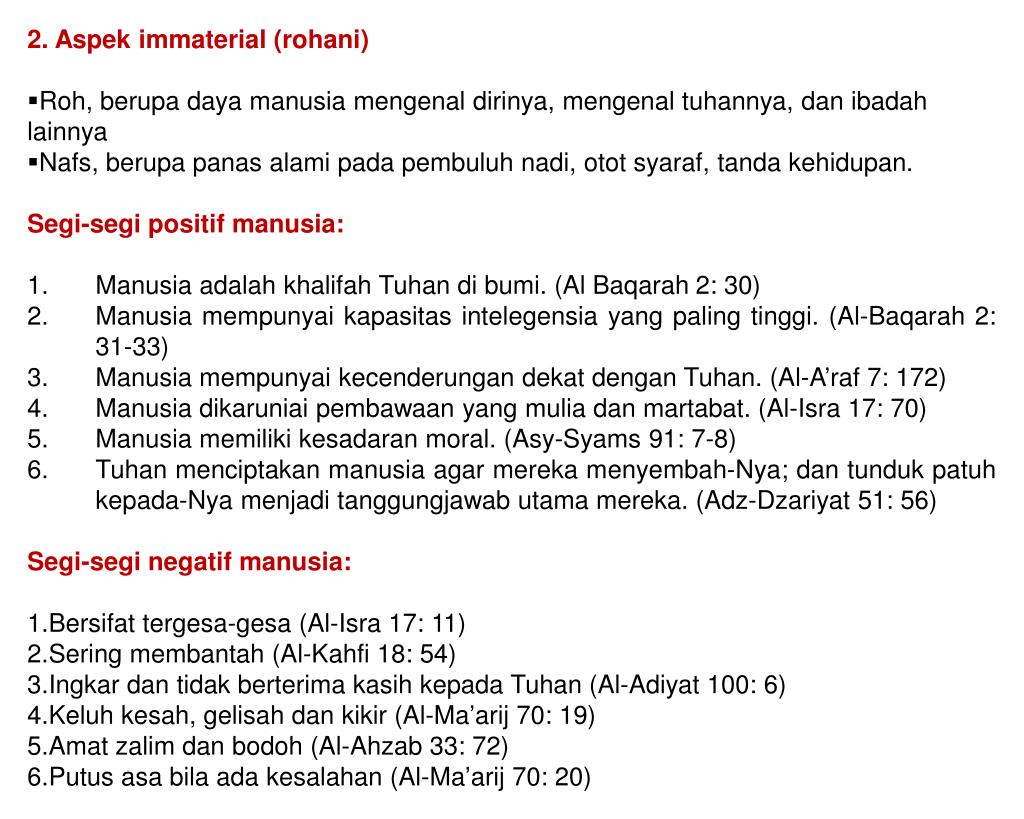 2. Aspek immaterial (rohani) • Roh, berupadayamanusiamengenaldirinya, mengenaltuhannya, danibadahlainnya • Nafs, berupapanasalamipadapembuluhnadi, ototsyaraf, tandakehidupan. • Segi-segi positif manusia: • Manusia adalah khalifah Tuhan di bumi. (Al Baqarah 2: 30) • Manusia mempunyai kapasitas intelegensia yang paling tinggi. (Al-Baqarah 2: 31-33) • Manusia mempunyai kecenderungan dekat dengan Tuhan. (Al-A’raf 7: 172) • Manusia dikaruniai pembawaan yang mulia dan martabat. (Al-Isra 17: 70) • Manusia memiliki kesadaran moral. (Asy-Syams 91: 7-8) • Tuhan menciptakan manusia agar mereka menyembah-Nya; dan tunduk patuh kepada-Nya menjadi tanggungjawab utama mereka. (Adz-Dzariyat 51: 56) • Segi-seginegatifmanusia: • Bersifattergesa-gesa (Al-Isra 17: 11) • Seringmembantah (Al-Kahfi 18: 54) • IngkardantidakberterimakasihkepadaTuhan (Al-Adiyat 100: 6) • Keluhkesah, gelisahdankikir (Al-Ma’arij 70: 19) • Amatzalimdanbodoh (Al-Ahzab 33: 72) • Putusasabilaadakesalahan (Al-Ma’arij 70: 20)