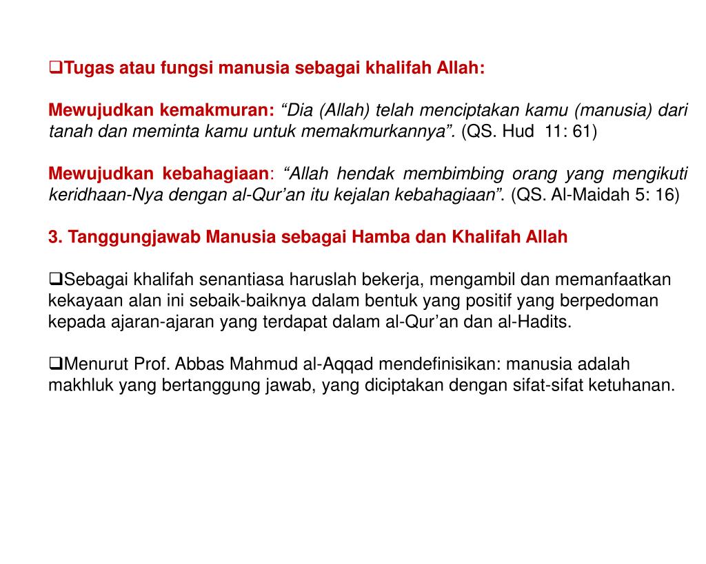 Tugas atau fungsi manusia sebagai khalifah Allah: • Mewujudkan kemakmuran: “Dia (Allah) telah menciptakan kamu (manusia) dari tanah dan meminta kamu untuk memakmurkannya”. (QS. Hud 11: 61) • Mewujudkan kebahagiaan: “Allah hendak membimbing orang yang mengikuti keridhaan-Nya dengan al-Qur’an itu kejalan kebahagiaan”. (QS. Al-Maidah 5: 16) • 3. Tanggungjawab Manusia sebagai Hamba dan Khalifah Allah • Sebagai khalifah senantiasa haruslah bekerja, mengambil dan memanfaatkan kekayaan alan ini sebaik-baiknya dalam bentuk yang positif yang berpedoman kepada ajaran-ajaran yang terdapat dalam al-Qur’an dan al-Hadits. • Menurut Prof. Abbas Mahmud al-Aqqad mendefinisikan: manusia adalah makhluk yang bertanggung jawab, yang diciptakan dengan sifat-sifat ketuhanan.